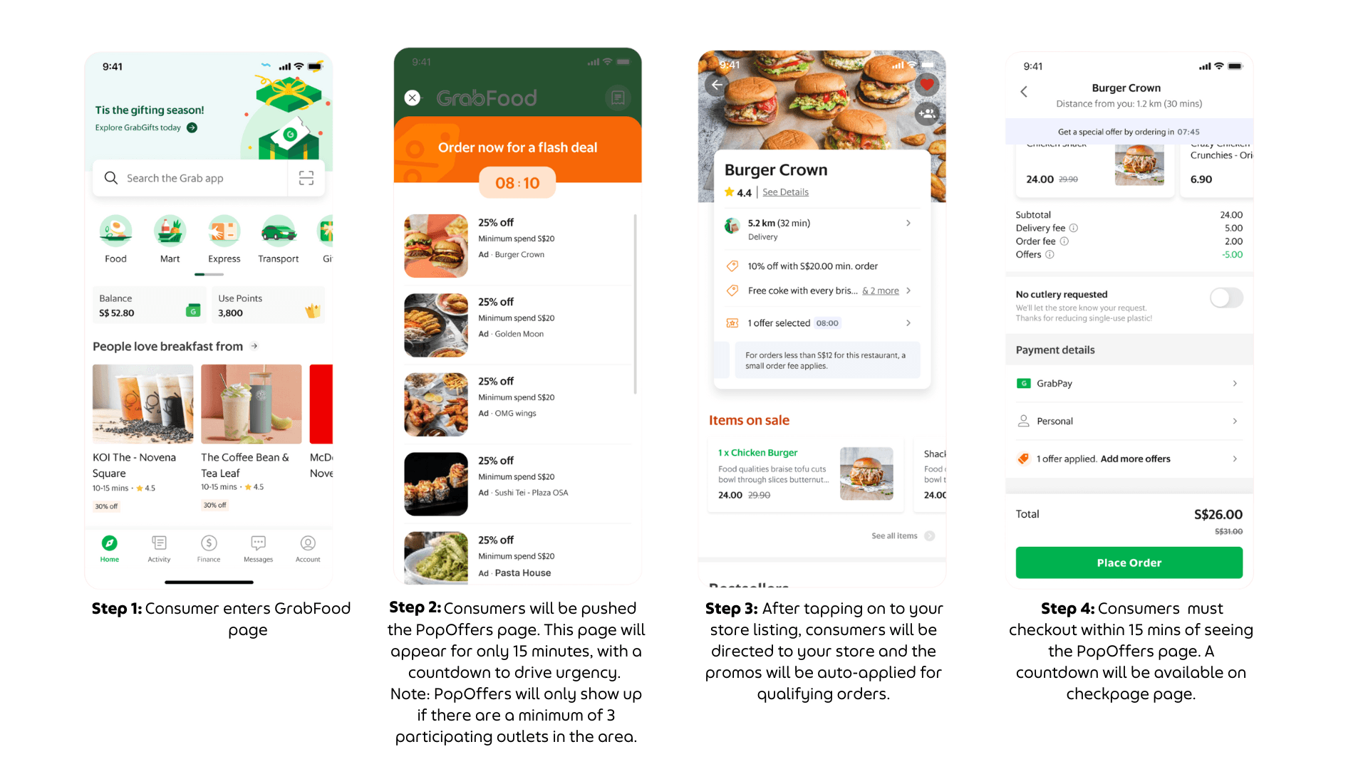 PopOffers shows attractive promos to high-intent and new consumers the moment they land on the GrabFood page. As soon as consumers open GrabFood, a full-screen pop-up appears to entice them with promos they won’t want to miss!