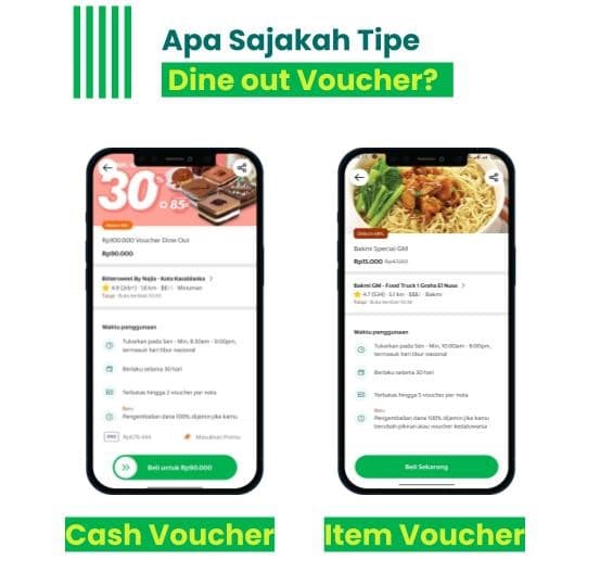 Grab juga menyediakan Dine Out Voucher, yang bisa dibeli dan digunakan langsung oleh Konsumen di outlet Anda. Voucher ini terdiri dari dua tipe yang bisa Anda tawarkan:
