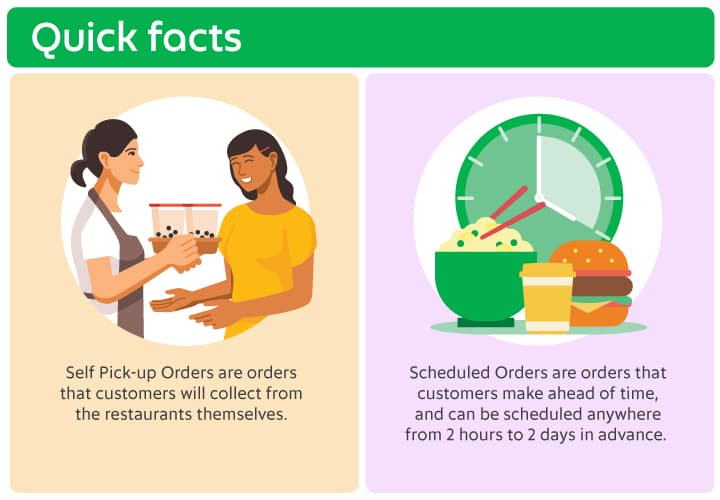 Anda mungkin sudah mengetahui tentang opsi pengiriman GrabFood standar, di mana Anda menyiapkan pesanan yang diterima melalui Aplikasi GrabMerchant segera, dan mitra pengiriman kemudian akan mengumpulkan dan mengirimkannya ke pelanggan Anda. Tapi tahukah Anda tentang pesanan Ambil Sendiri dan pesanan terjadwal?