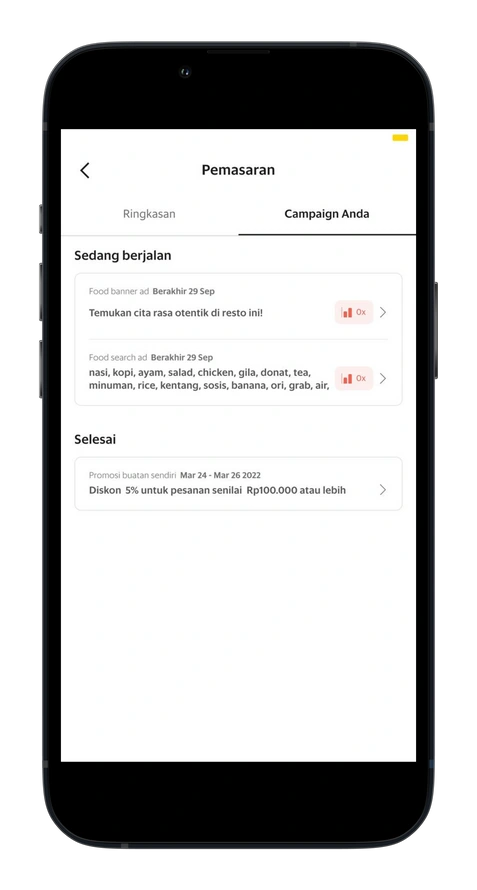 Cek performa iklan Anda melalui Aplikasi GrabMerchant.