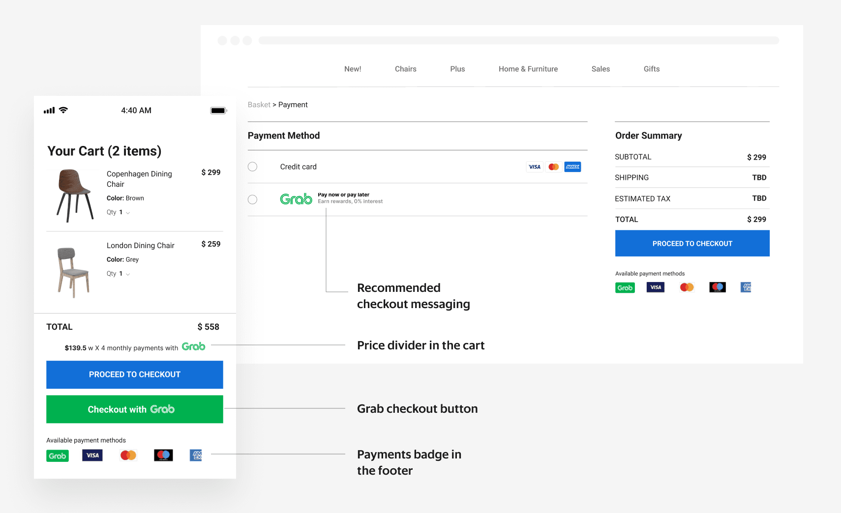 Gunakan elemen laman web kedai yang sedia ada secara konsisten di seluruh laman web kedai anda untuk memaklumkan pembeli tentang perkhidmatan PayLater by Grab semasa pembayaran.