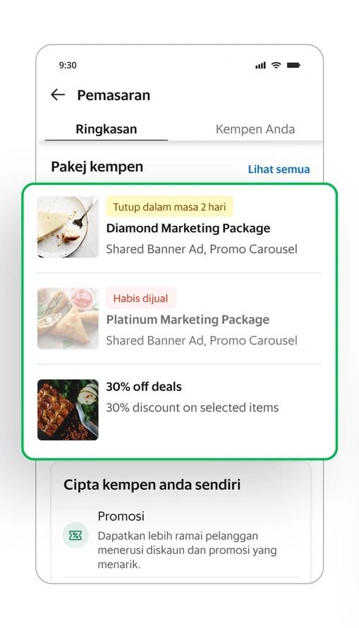 Anda ingin mengembangkan perniagaan anda, dapatkan lebih ramai pelanggan melalui promosi restoran, mart, atau laman web eCommerce anda. Tetapi anda tidak tahu bagaimana hendak mula mencorak strategi pemasaran dan pengiklanan. Jangan risau. Kami boleh menolong anda melalui Kempen Berpakej, Promosi, dan Pengiklanan oleh Grab!