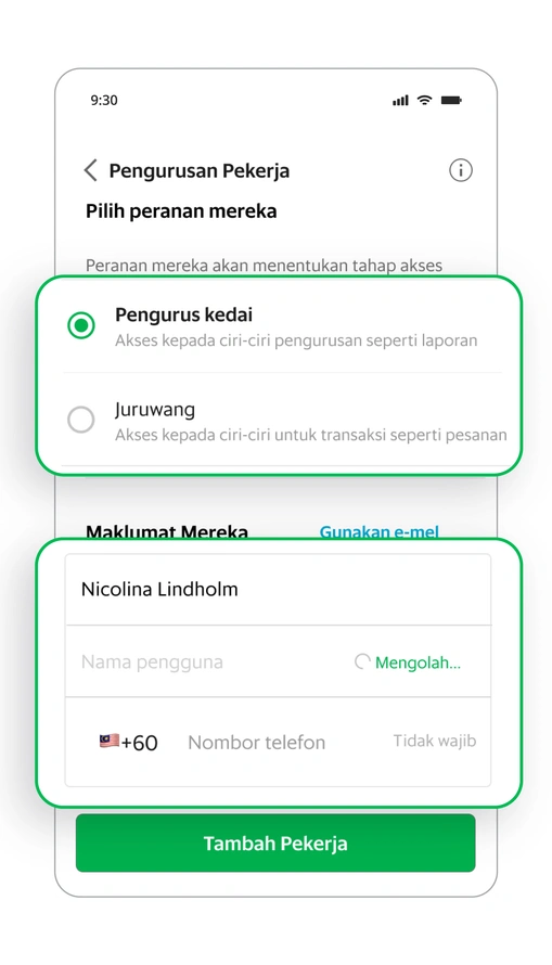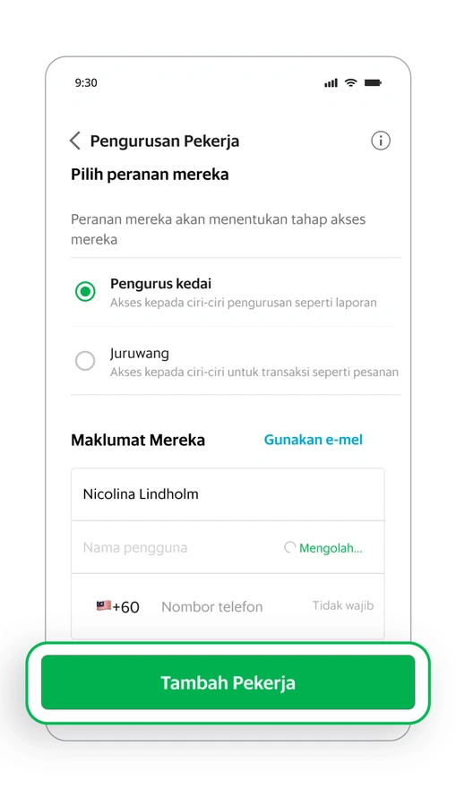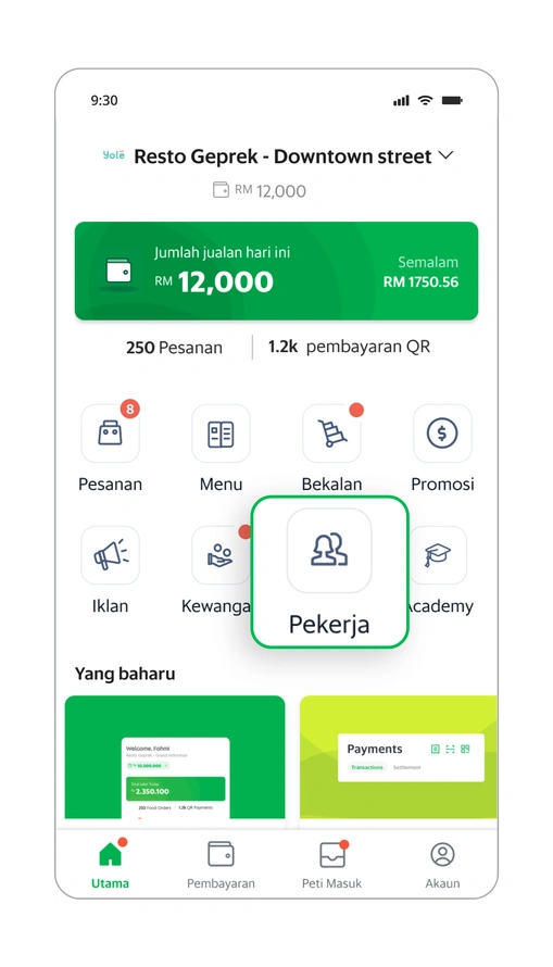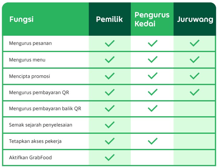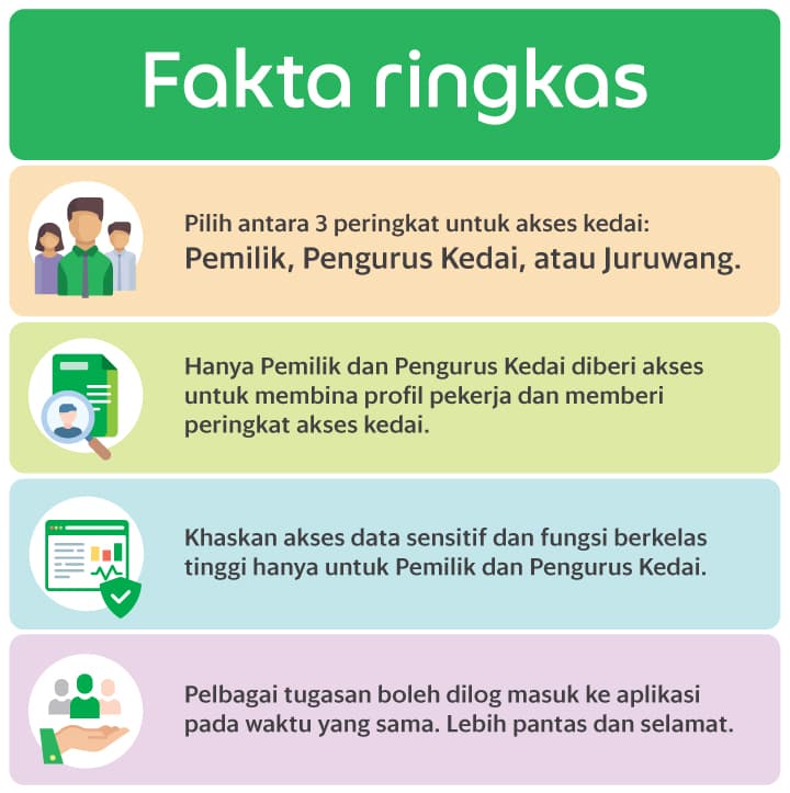 Anda boleh daftarkan profil khas untuk setiap pekerja anda dalam Aplikasi GrabMerchant. Ia juga membolehkan anda menentukan akses kedai yang diberi mengikut tugasan pekerja anda. Juruwang anda hanya perlu fokus kepada tugas melengkapkan pesanan dan menerima pembayaran. Pemilik dan pengurus kedai pula, boleh semak analisis kedai, dan mencipta promosi, mengedit menu, mengurus pembayaran balik dan lebih lagi.