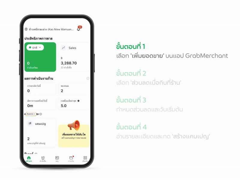 หากคุณเป็นพาร์ทเนอร์ร้านค้ากับ Grab อยู่แล้ว คุณสามารถสร้าง 'ส่วนลดเมื่อกินที่ร้าน' ผ่านแอป GrabMerchant ของคุณได้ทันทีในไม่กี่คลิก!