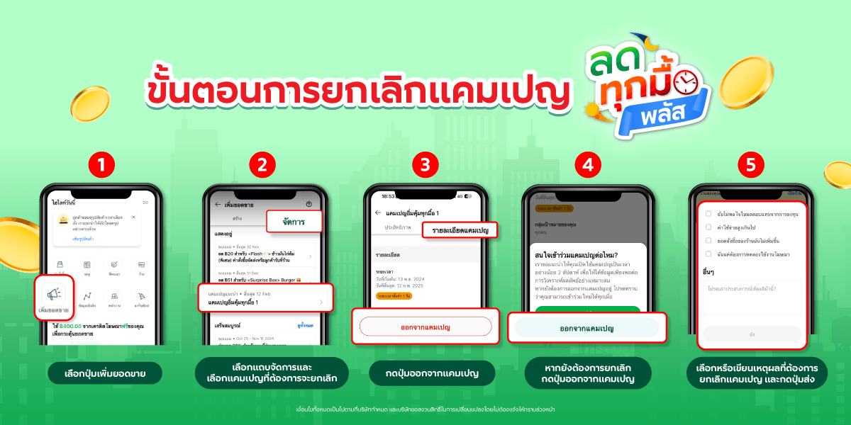 ในกรณีที่ร้านค้าไม่ต้องการเข้าร่วมแคมเปญ “ร้านเล็กลดทุกมื้อ 20%” และ “ร้านเล็กลดทุกมื้อ 10%” ร้านค้าจะต้องยกเลิกการเข้าร่วมแคมเปญ “ลดทุกมื้อ พลัส 40%” และ “ลดทุกมื้อ พลัส 20%” ก่อนระยะเวลาของแคมเปญ “ลดทุกมื้อ พลัส 40%” และ “ลดทุกมื้อ พลัส 20%” ของรอบที่ร้านค้าเข้าร่วมจะสิ้นสุดลง