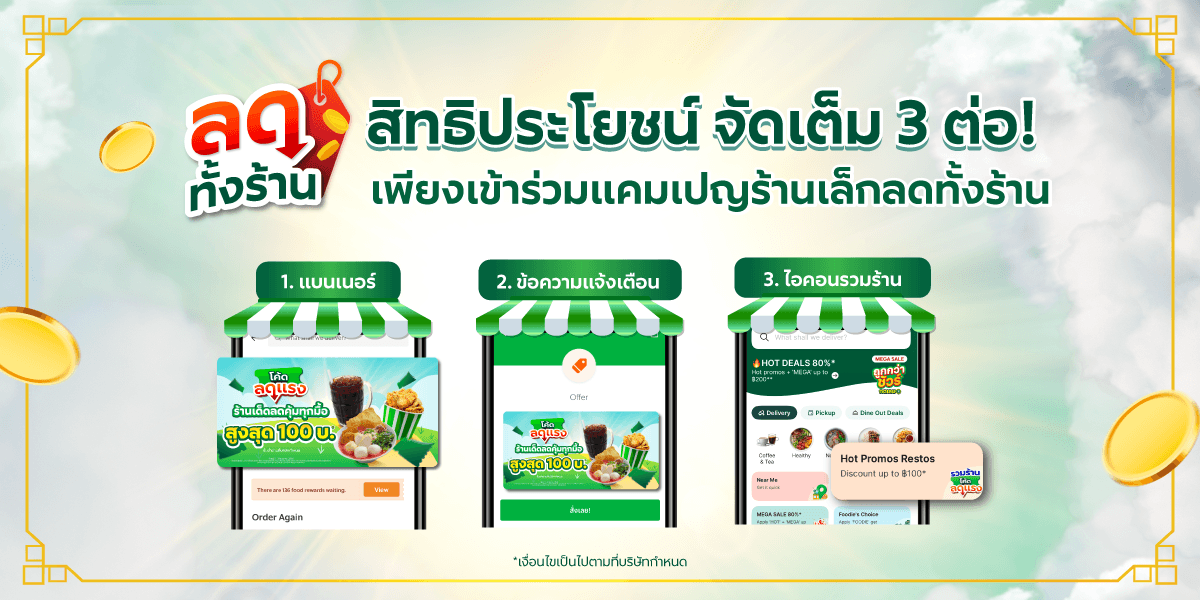 แคมเปญร้านเล็กลดทั้งร้าน คือ แคมเปญพิเศษที่ช่วยกระตุ้นยอดขาย โดยการเพิ่มการมองเห็นของลูกค้าผ่านสื่อการตลาดในแอป และโค้ดส่วนลดสนับสนุน ผ่านเครื่องมือทางการตลาดที่หลากหลายจาก Grab