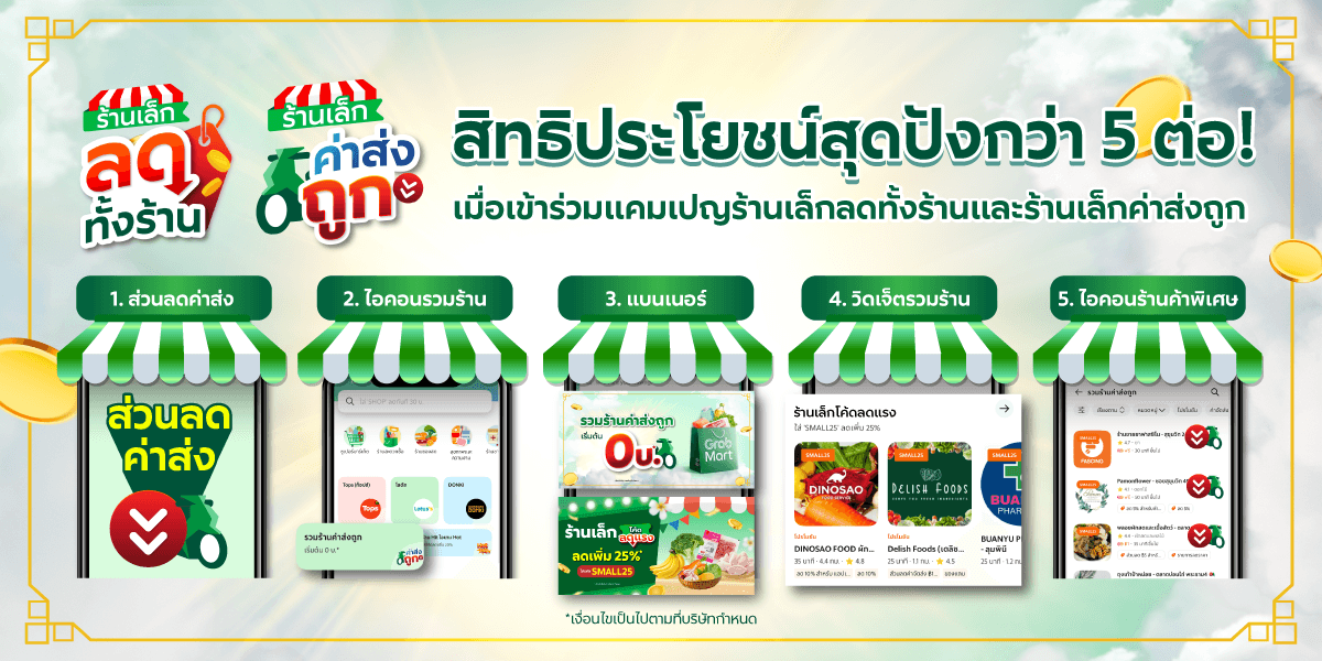 - เมื่อร้านกดเข้าร่วมแคมเปญ ร้านค้าจะได้รับสื่อโปรโมตในแอปพลิเคชันแกร็บ และโค้ดส่วนลดร้านค้าในแคมเปญ ภายในเวลาที่แกร็บกำหนด (ไม่เกิน 60 นาทีหลังจากกดเข้าร่วมแคมเปญ) โดยร้านค้าจะโดนเก็บค่าธรรมเนียมแคมเปญทันทีหลังกดเข้าร่วมแคมเปญ