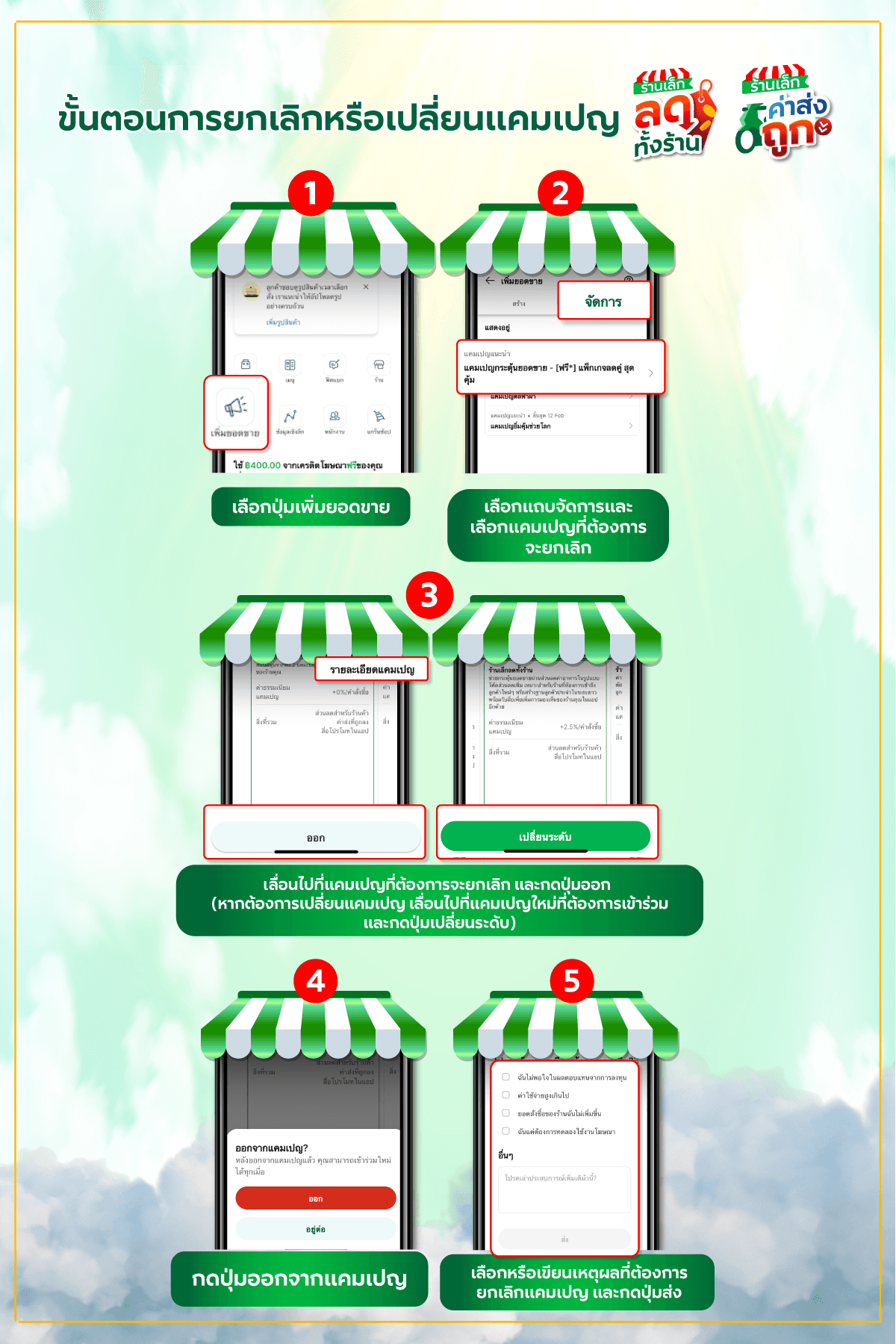 ร้านค้าสามารถยกเลิกแพ็กเกจแคมเปญได้ตลอดเวลา โดยไม่มีค่าธรรมเนียมการยกเลิก ทั้งนี้ ร้านค้าจะต้องอยู่ในแคมเปญอย่างน้อย 24 ชม. หลังกดเข้าแคมเปญ ก่อนที่จะยกเลิกได้