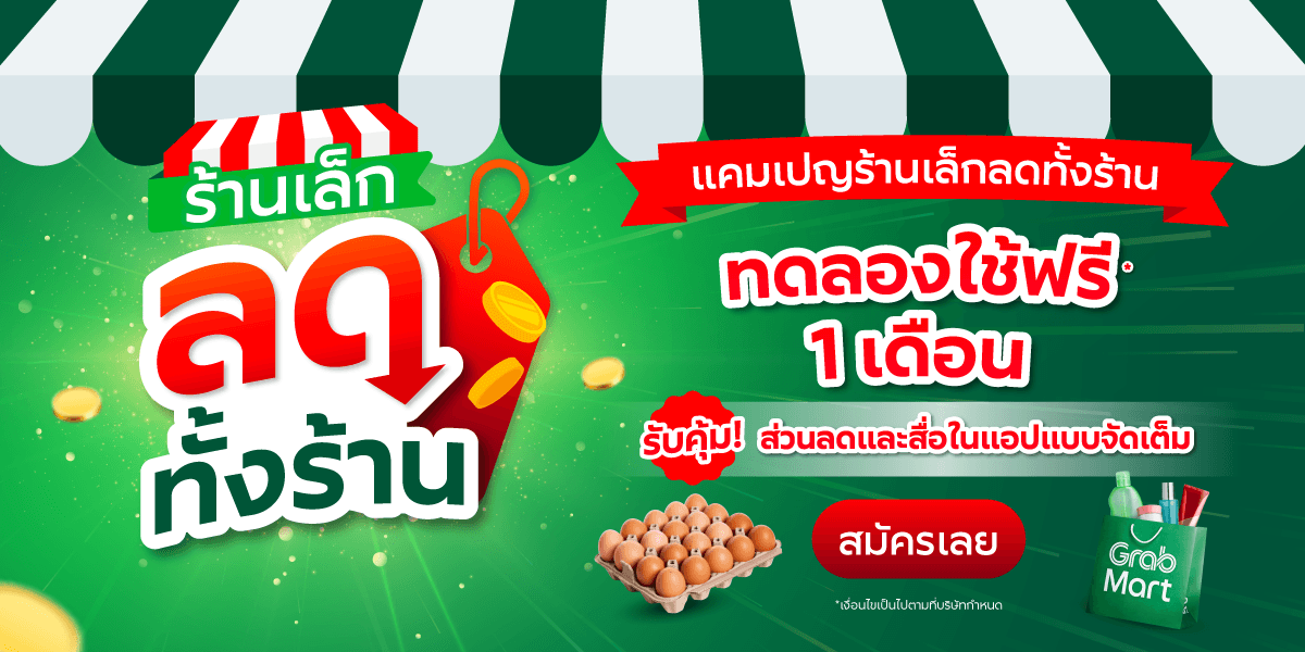 แคมเปญร้านเล็กลดทั้งร้าน คือ แคมเปญพิเศษที่ช่วยกระตุ้นยอดขาย โดยการเพิ่มการมองเห็นของลูกค้าผ่านสื่อการตลาดในแอป และโค้ดส่วนลดสนับสนุน ผ่านเครื่องมือทางการตลาดที่หลากหลายจาก Grab