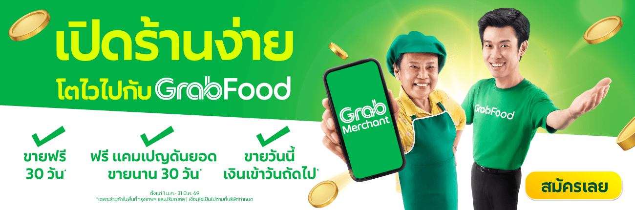 📝สมัครง่าย ๆ ด้วยตนเองผ่านแอป GrabMerchant หรือแอดไลน์ @GrabMerchantTH ที่จะมีผู้ช่วยสมัครให้ทุกขั้นตอน พร้อมกรอกรหัสผู้แนะนำ GP0 ตอนสมัคร ในช่วงวันที่ 1 ม.ค. - 31 มี.ค. 2569 รับเลยสิทธิพิเศษดังต่อไปนี้