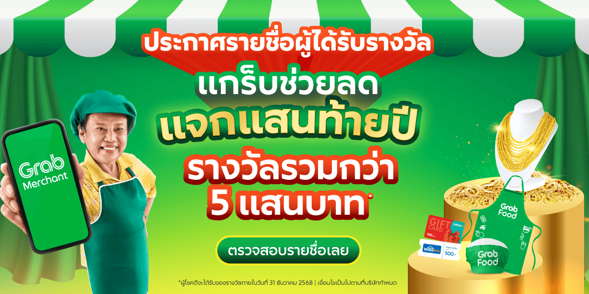 สำหรับร้านค้าที่เข้าร่วมแคมเปญ “แกร็บช่วยลด” ก่อนวันที่ 15 กันยายน 2568 และเป็นผู้ชนะรางวัลกิจกรรม "แกร็บช่วยลดแจกแสนท้ายปี” บริษัทจะดำเนินการจัดส่งรางวัลตามที่อยู่ที่ร้านค้าได้ระบุไว้ในแบบฟอร์มเท่านั้น โดยรางวัลจะได้รับการจัดส่งตามวิธีการที่บริษัท เห็นสมควร ภายในวันที่ 31 ธันวาคม 2568 หรือระยะเวลาอื่นใดตามที่บริษัทกำหนด