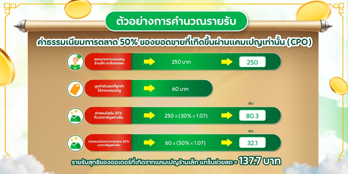 ร้านค้าสามารถดูตัวอย่างของการคำนวณค่าธรรมเนียมทางการตลาดในรูปภาพตัวอย่างการคำนวณรายรับในหัวข้อ ‘ค่าใช้จ่ายในการเข้าร่วมแคมเปญแกร็บช่วยลด’