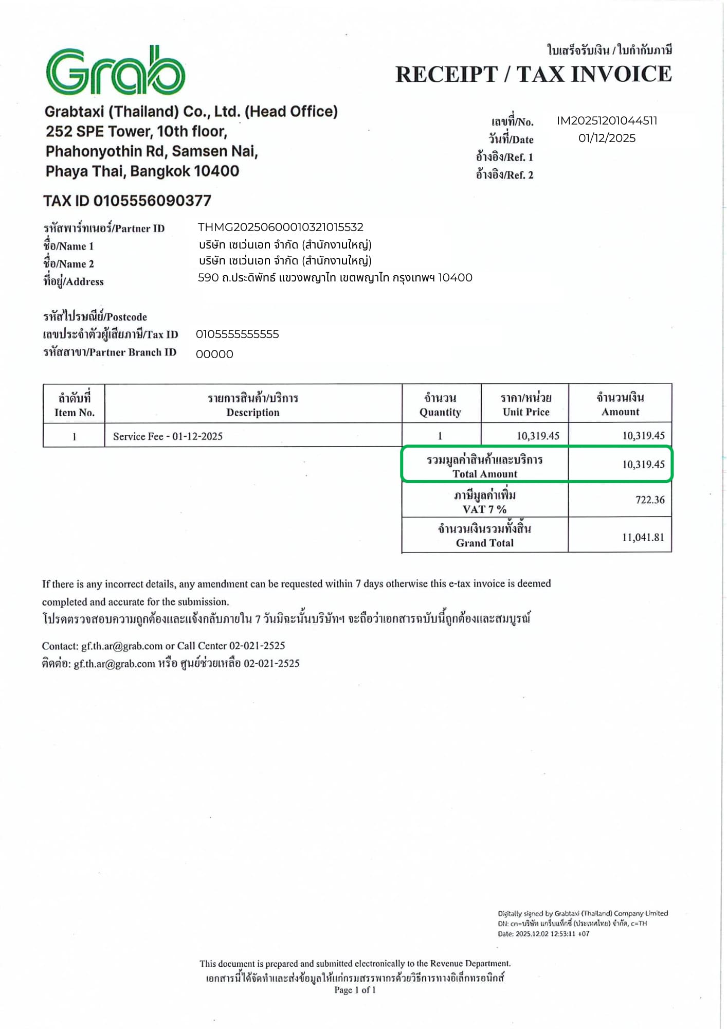 ใบเสร็จรับเงิน/ใบกำกับภาษี รายวันที่แกร็บออกให้ โดยใช้ยอดก่อนภาษีมูลค่าเพิ่ม คูณอัตราภาษี หัก ณ ที่จ่าย