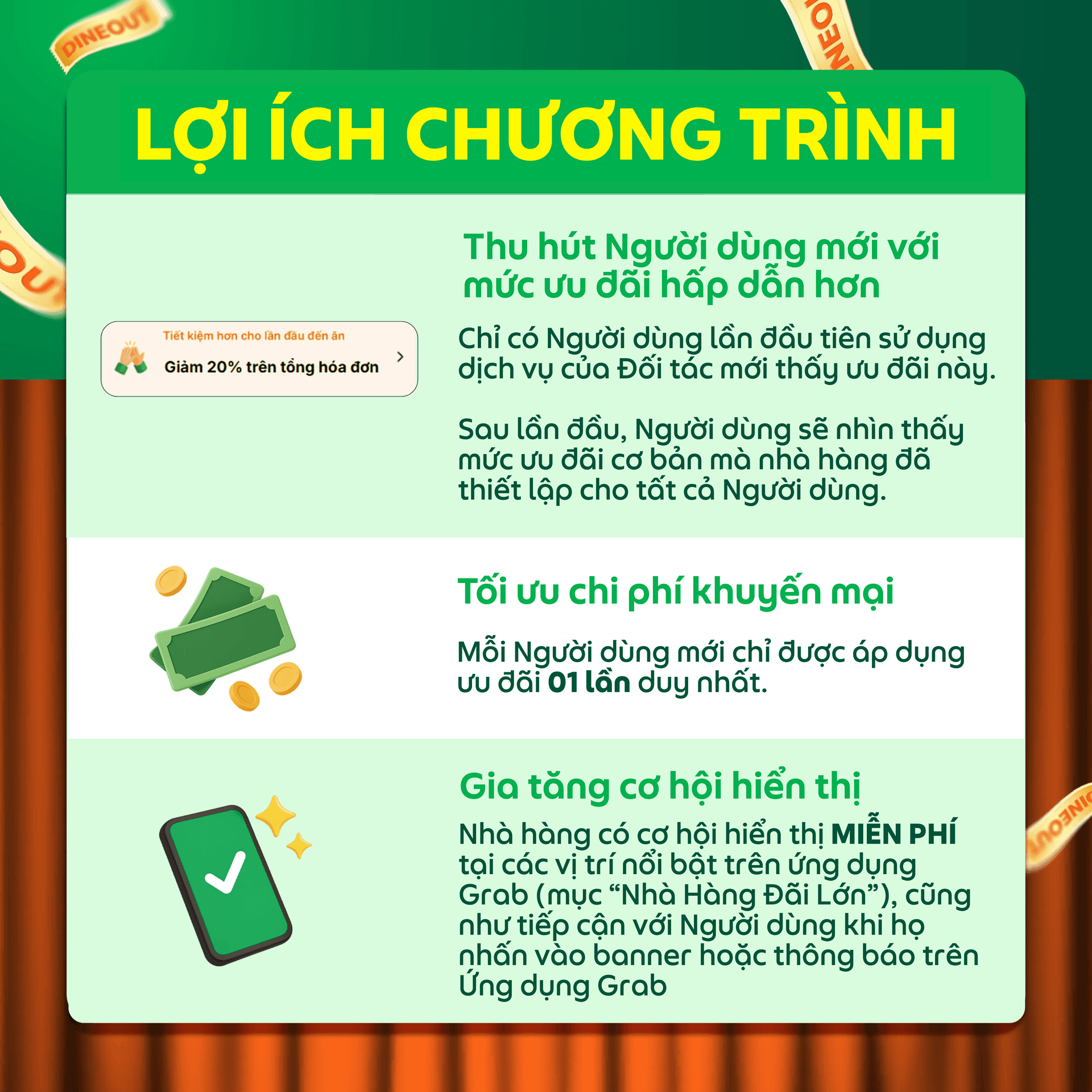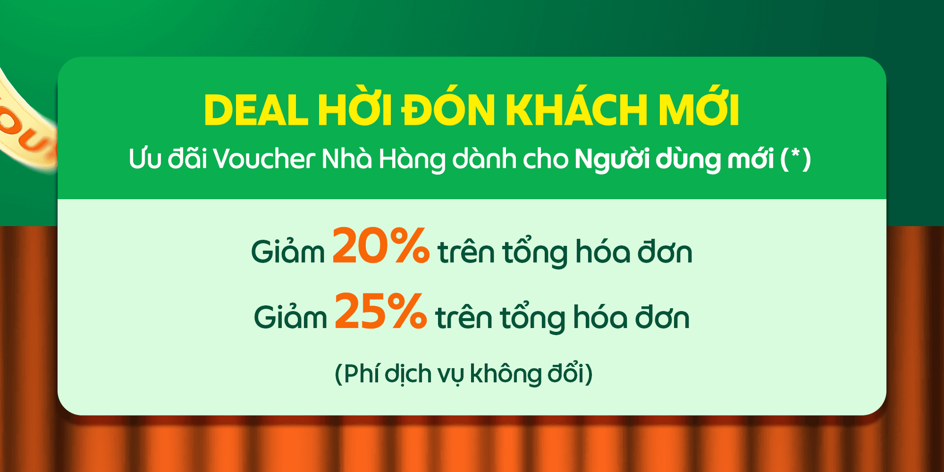 Thông qua chương trình, Người dùng lần đầu đến dùng bữa tại nhà hàng của Đối tác sẽ nhận được Voucher Nhà Hàng với mức ưu đãi hấp dẫn hơn.