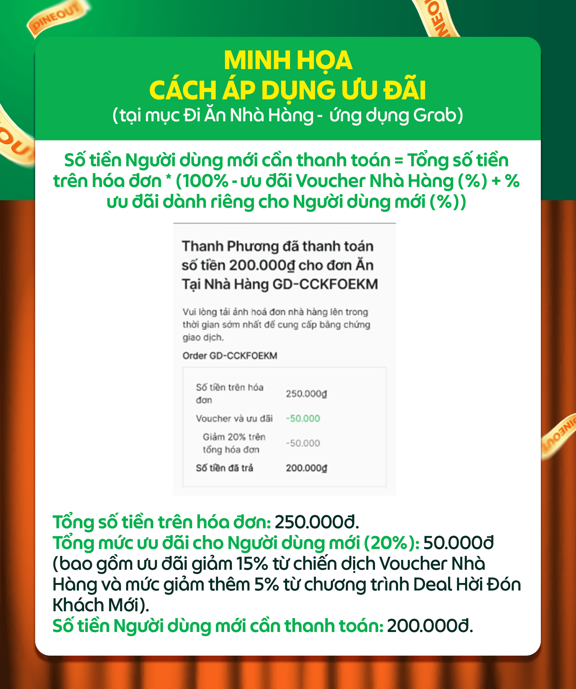 Mức ưu đãi dành cho Người dùng mới không thấp hơn mức ưu đãi Voucher Nhà Hàng hiện có của nhà hàng. Xem chi tiết tại email với tiêu đề Grab | Giải pháp tăng trưởng Người dùng mới (dành cho dịch vụ Đi Ăn Nhà Hàng).
