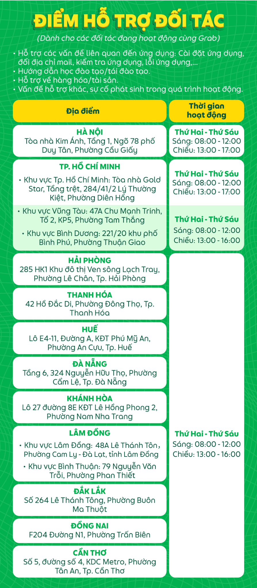 Với mục đích thuận tiện hỗ trợ cho quý Đối tác Nhà hàng & Đối tác Thương nhân khi gặp khó khăn trong quá trình vận hành trên ứng dụng Grab. Grab cập nhật địa chỉ và thời gian làm việc của các điểm hỗ trợ Grab trên toàn quốc như sau: