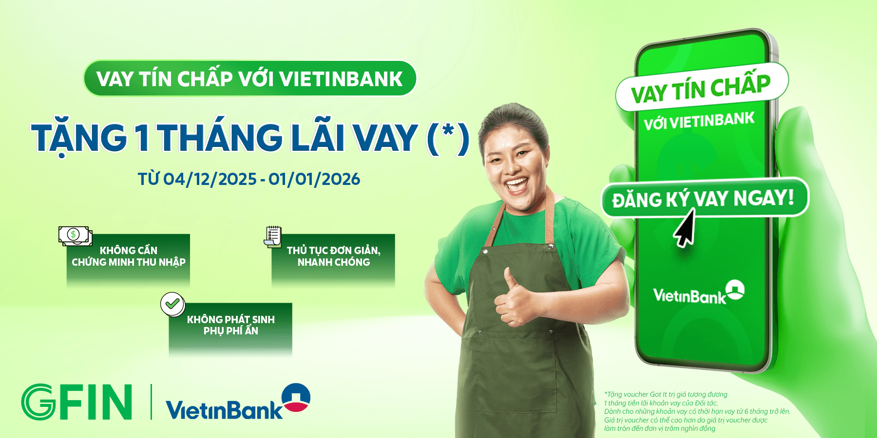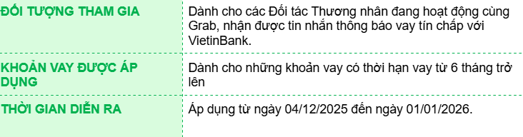 Công ty TNHH GFIN Việt Nam (“GFIN”) mang đến cho các Đối tác Thương nhân Grab chương trình tặng voucher Got It tương đương 01 tháng lãi vay cùng VietinBank(*). Cụ thể như sau: