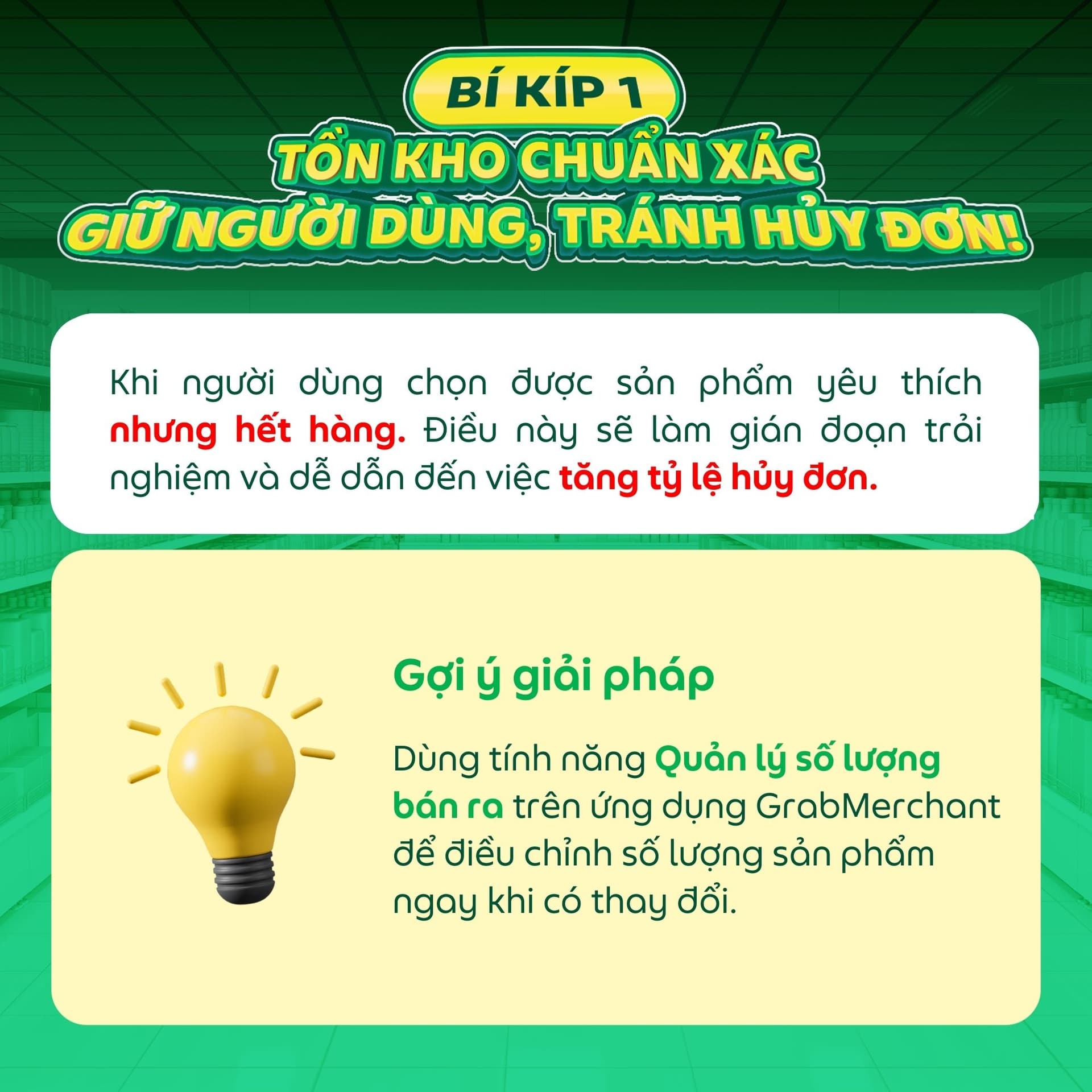 Đơn hàng bị hủy vì hết hàng có thể khiến người dùng hụt hẫng và ảnh hưởng đến uy tín gian hàng, đồng thời giảm tỷ lệ quay lại đặt hàng của người dùng. Nhưng đừng lo! Grab sẽ cùng Đối tác ‘tìm cách’ giảm Tỷ lệ hủy đơn một cách hiệu quả giúp giữ trải nghiệm mua sắm mượt mà cho người dùng nhé!