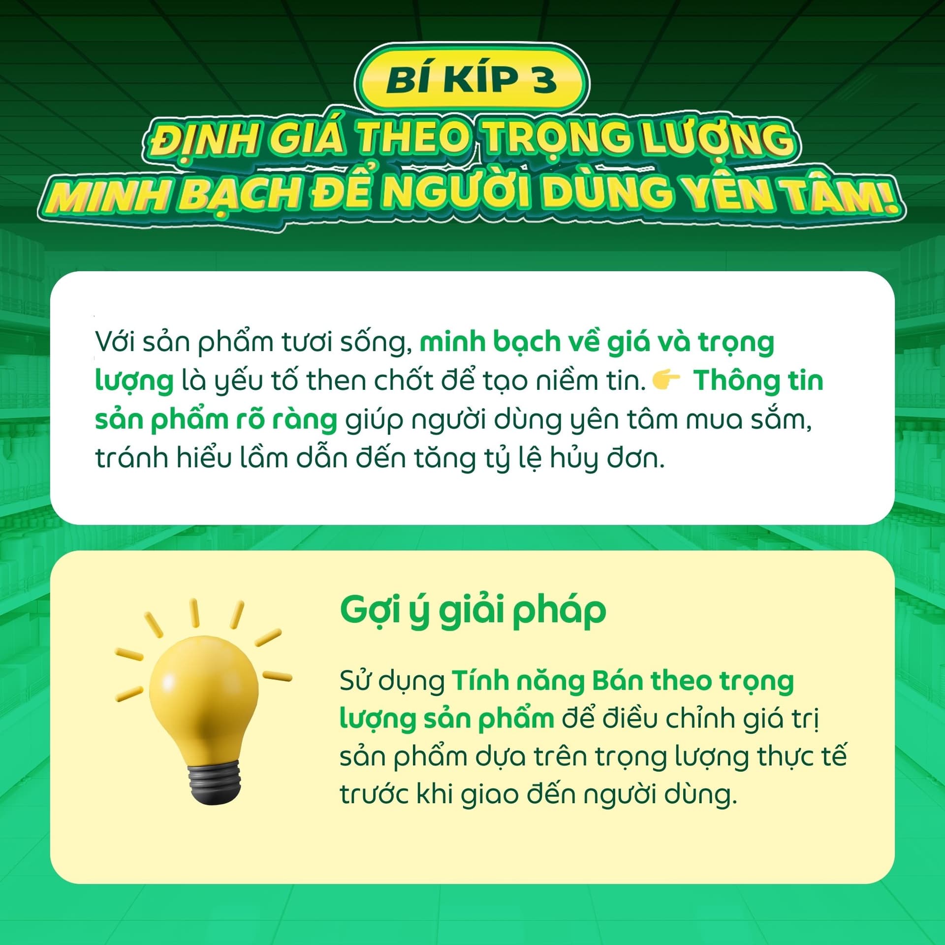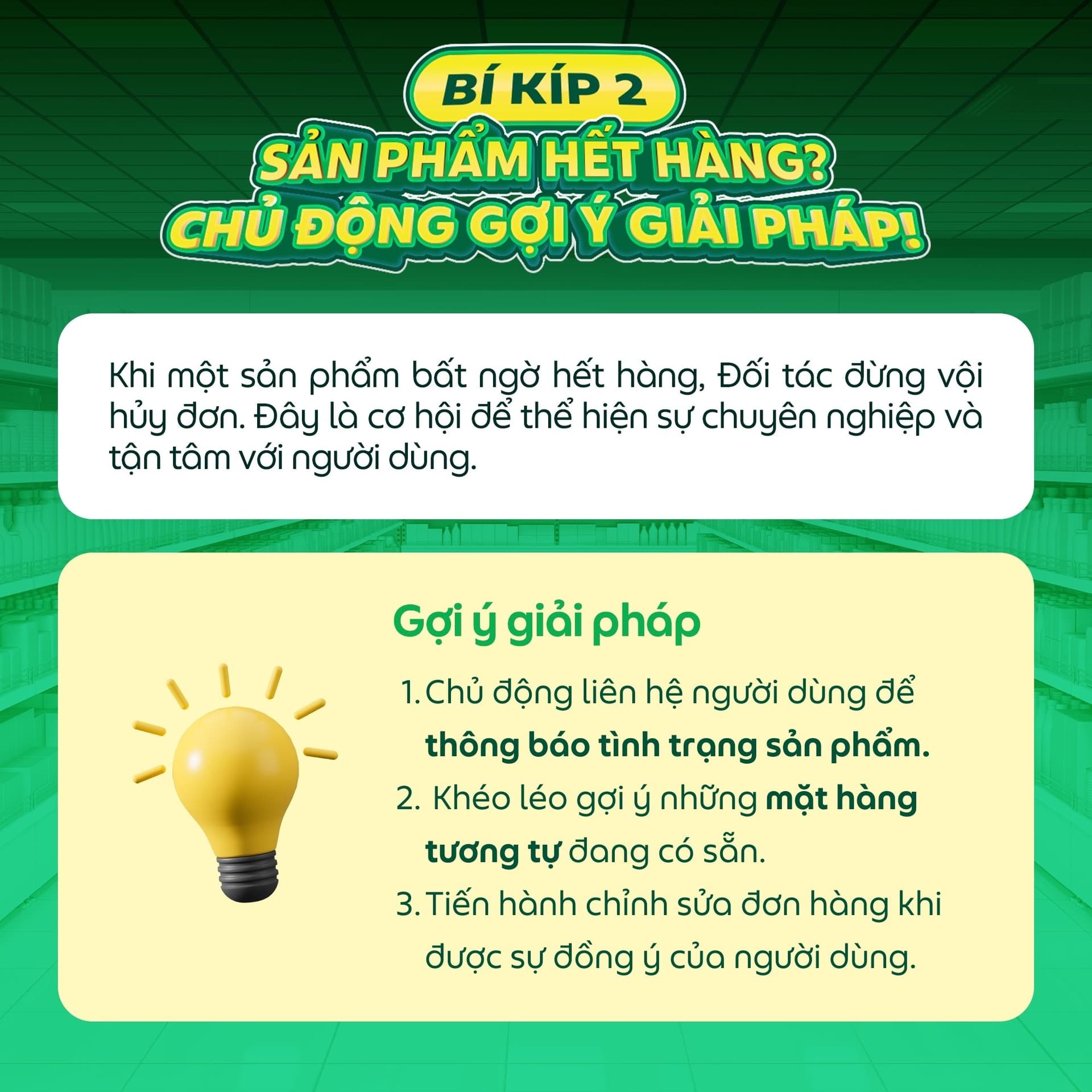 Chỉ với những bước đơn giản như cập nhật tồn kho, gợi ý sản phẩm thay thế và định giá theo trọng lượng, Đối tác đã có thể giữ đơn ổn định và mang đến trải nghiệm tốt hơn cho người dùng.