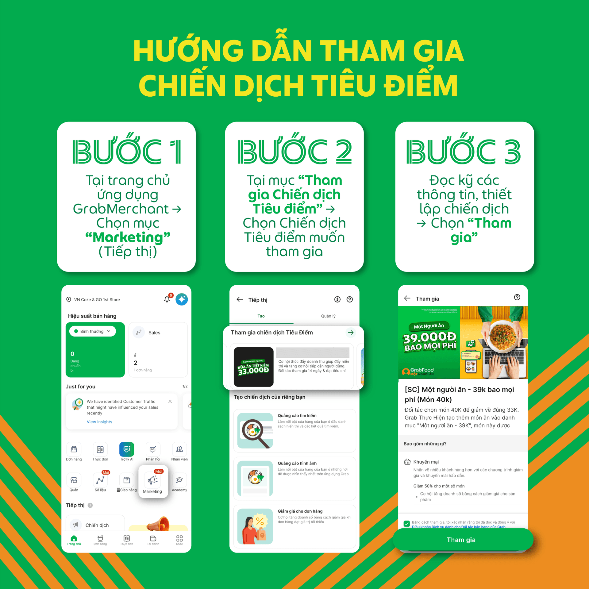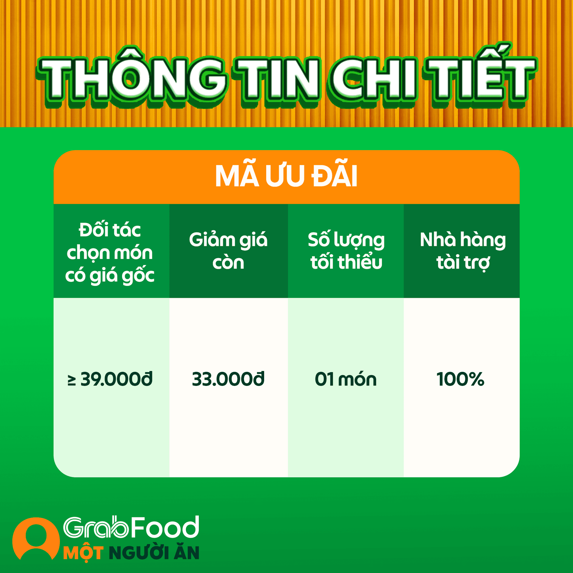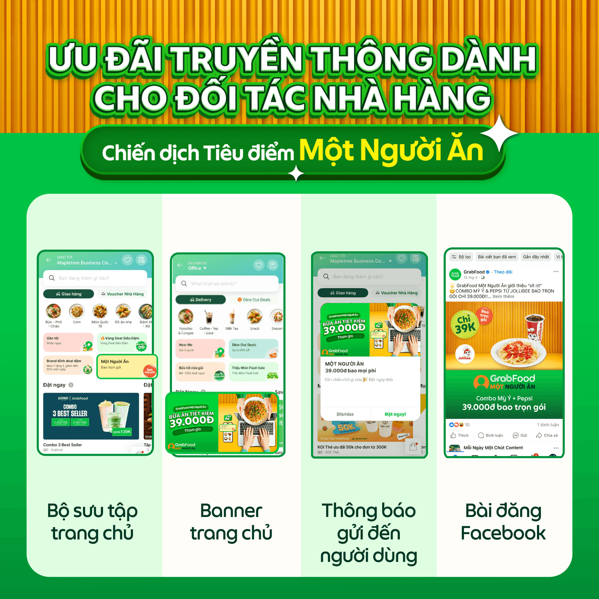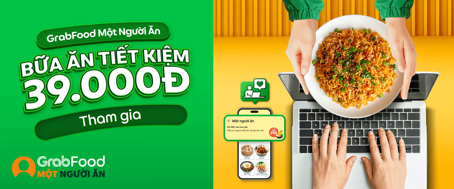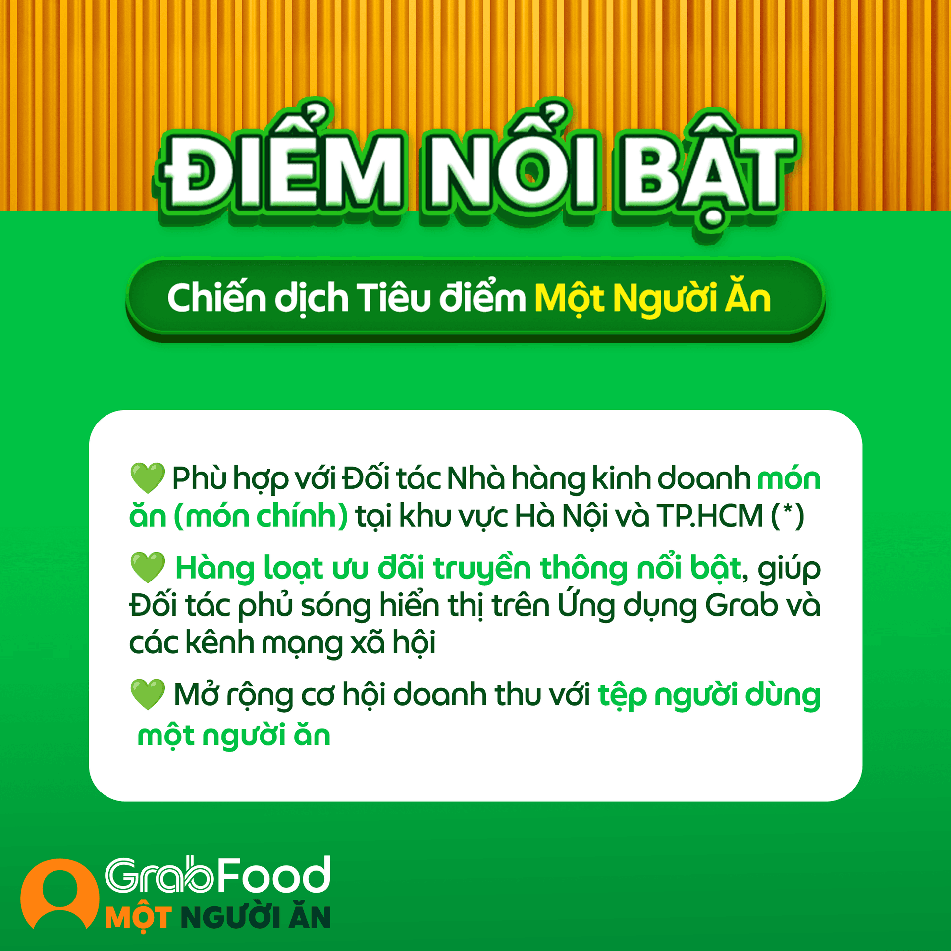 Grab giới thiệu đến Quý Đối tác Chiến dịch Tiêu điểm Một Người Ăn, giúp Quý Đối tác tại khu vực Hà Nội và TP.HCM (*) mở rộng cơ hội doanh thu với tệp người dùng một người ăn.