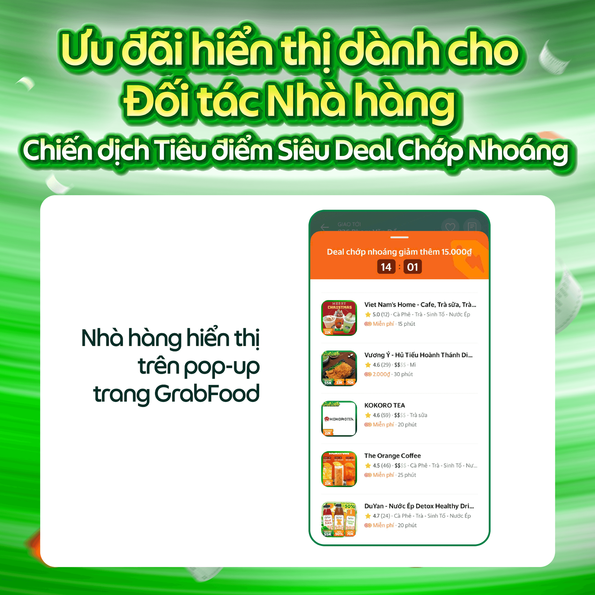Grab giới thiệu đến Quý Đối tác Chiến dịch Tiêu điểm Siêu Deal Chớp Nhoáng, giúp Đối tác thu hút khách mới, “bão đơn” với hiển thị nổi bật ngay tại cửa sổ pop-up khi vào GrabFood.