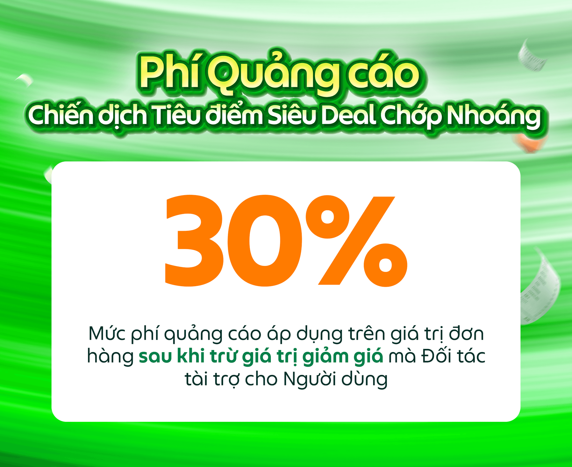Phí quảng cáo: sẽ được cấn trừ vào doanh thu của cửa hàng vào ngày kế tiếp. Cấn trừ được thực hiện kể cả khi doanh thu ngày kế tiếp có thể nhỏ hơn phí quảng cáo. Phí quảng cáo được cấn trừ mỗi ngày có thể khác nhau. Trong trường hợp phí quảng cáo áp dụng theo tỷ lệ phần trăm thì chi phí này sẽ dựa trên giá trị đơn hàng sau khi trừ giá trị giảm giá mà Đối tác tài trợ.