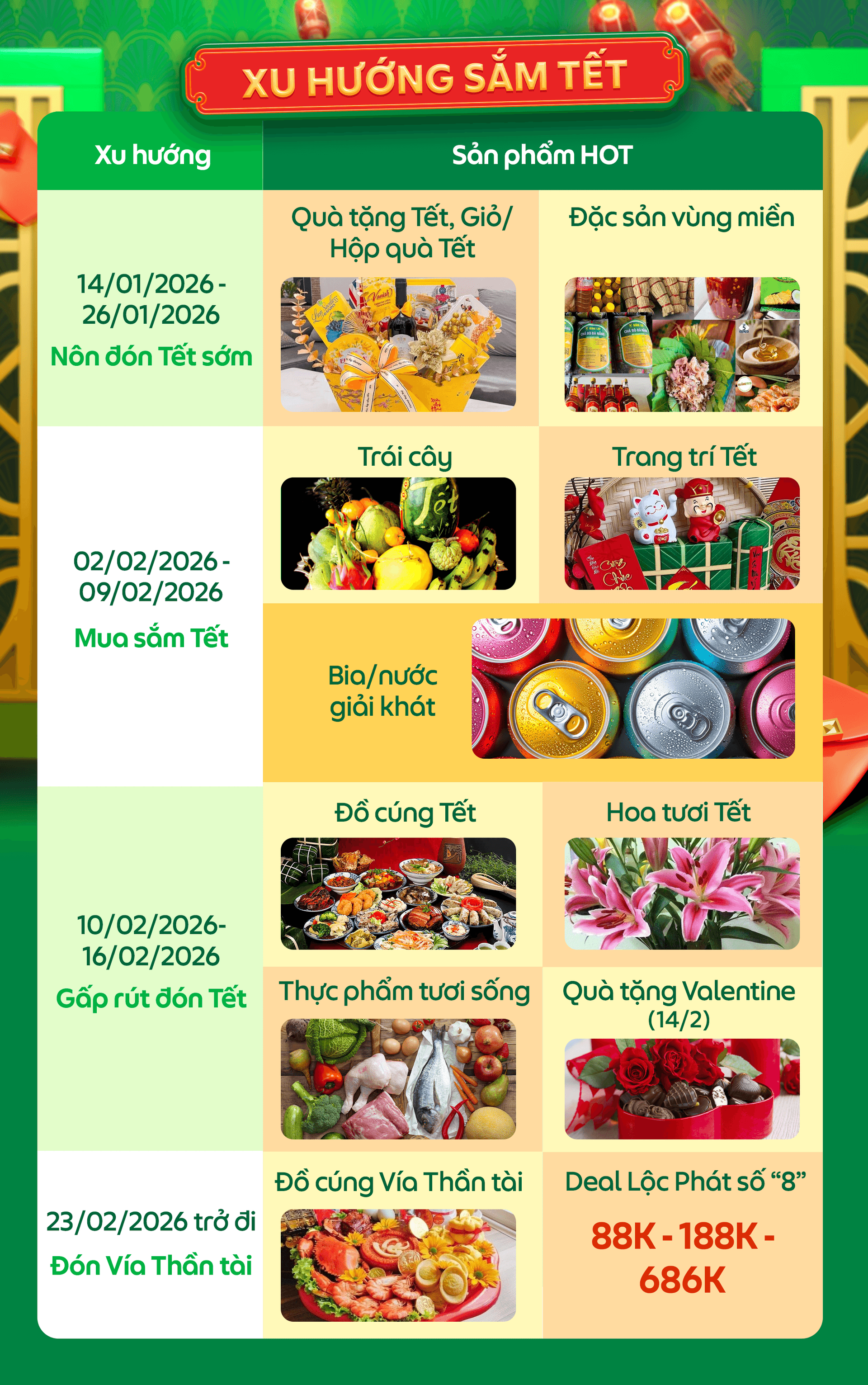 Đối tác hãy tham khảo ngay thông tin chi tiết bên dưới để nắm bắt đúng thời gian cao điểm của từng ngành hàng, lên deal bán Tết cùng GrabMart nhé!