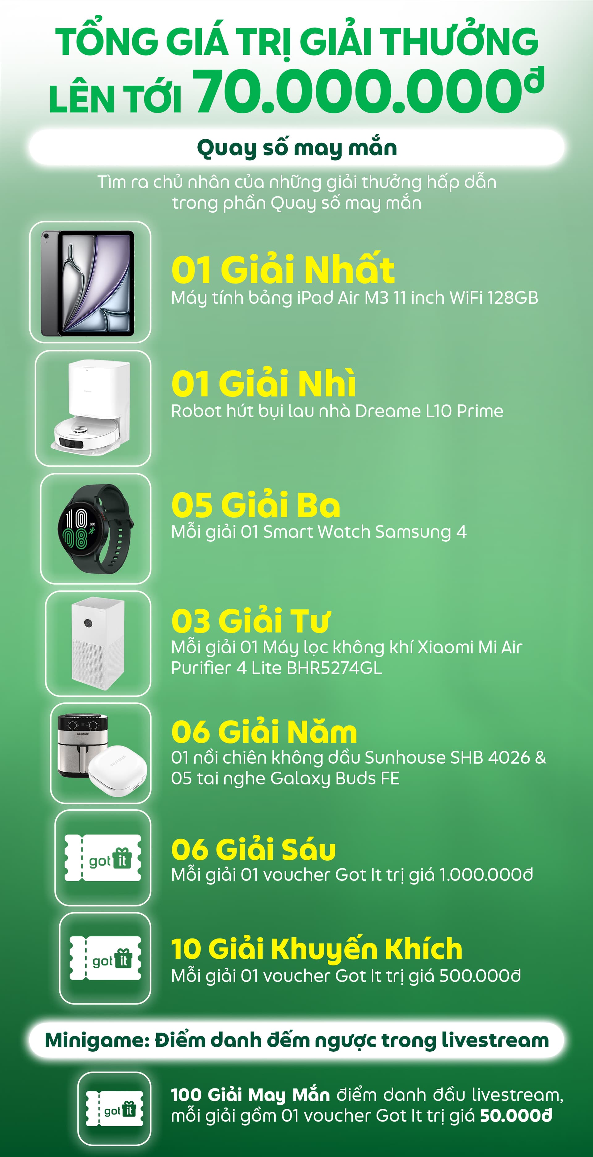 3️⃣ ĐẶC BIỆT: QUAY SỐ MAY MẮN TRỰC TUYẾN & MINIGAME TƯƠNG TÁC ngay trên sóng livestream, với tổng giá trị giải thưởng lên đến 70.000.0000đ dành riêng cho Đối tác may mắn & theo dõi Livestream