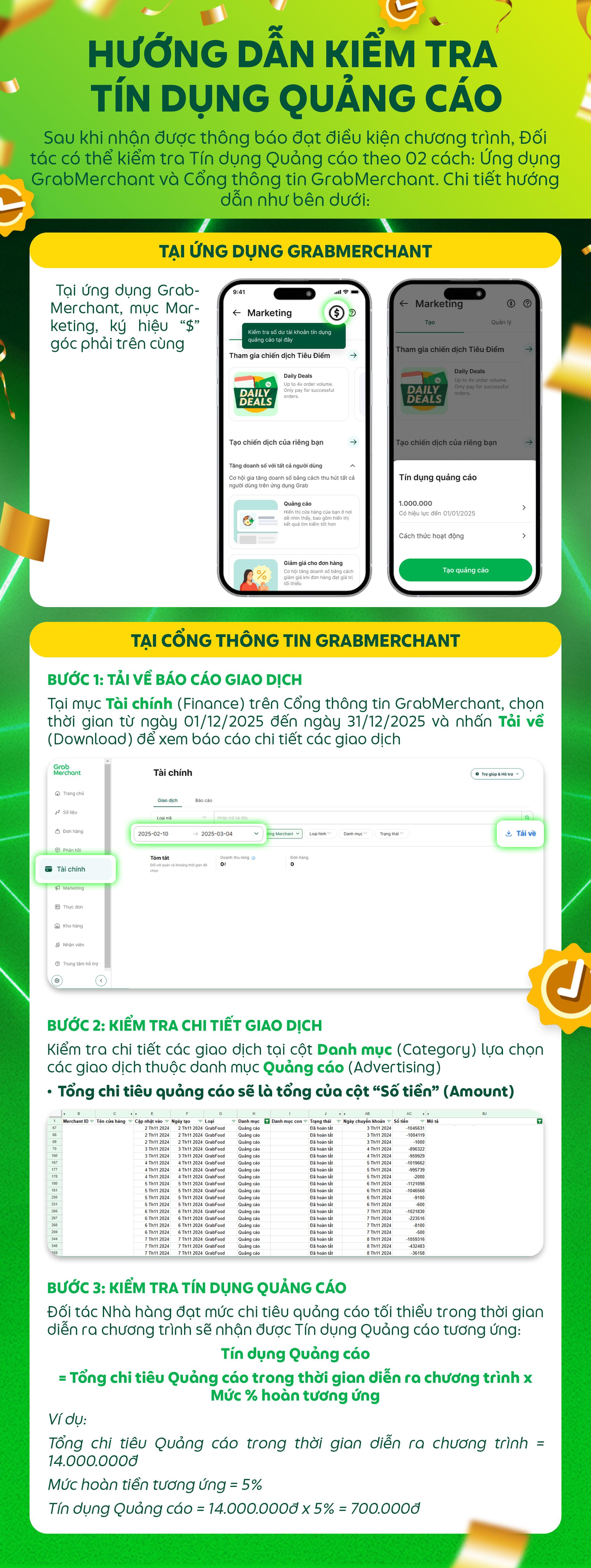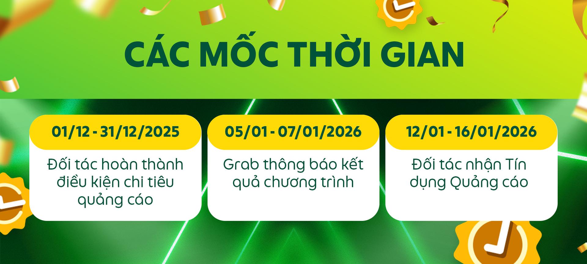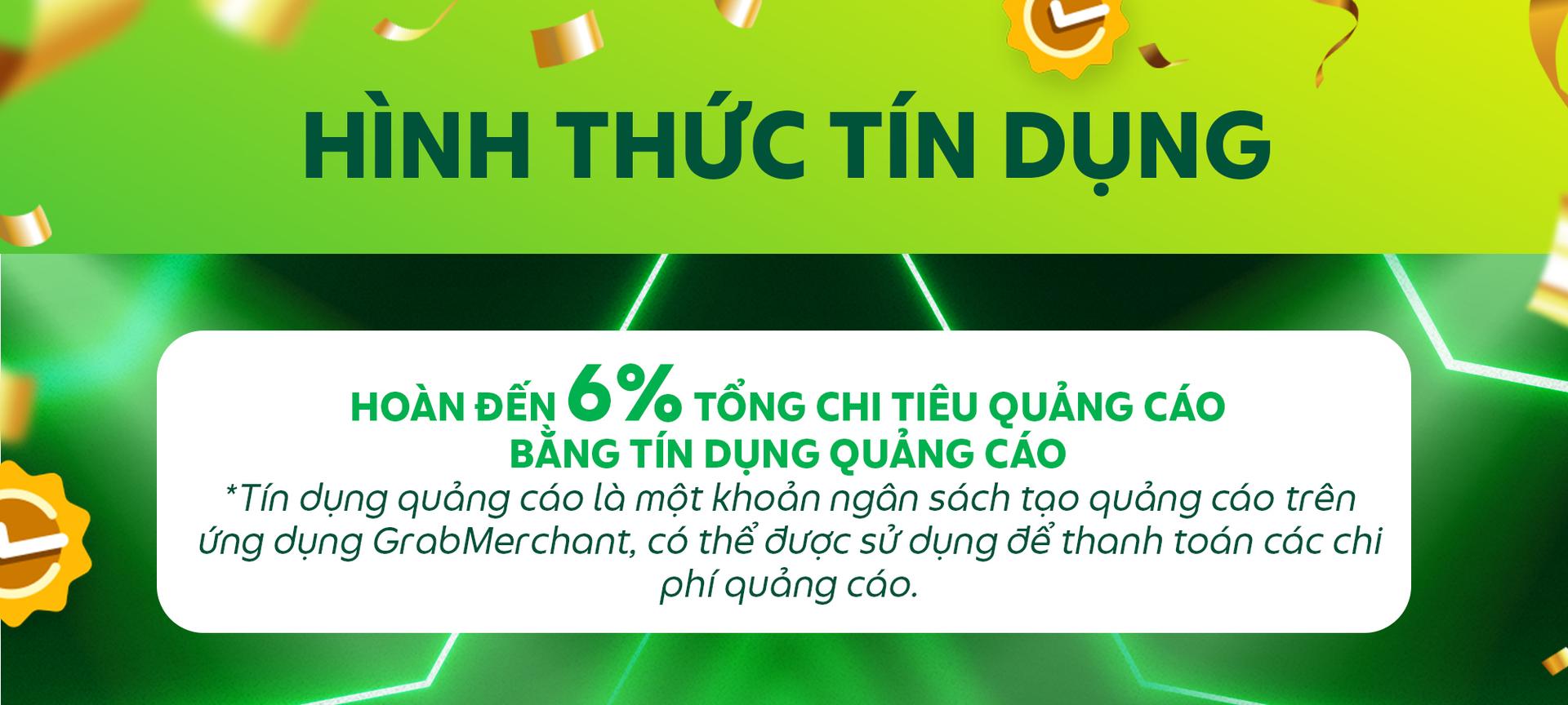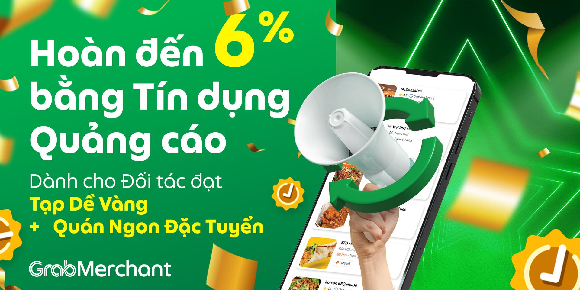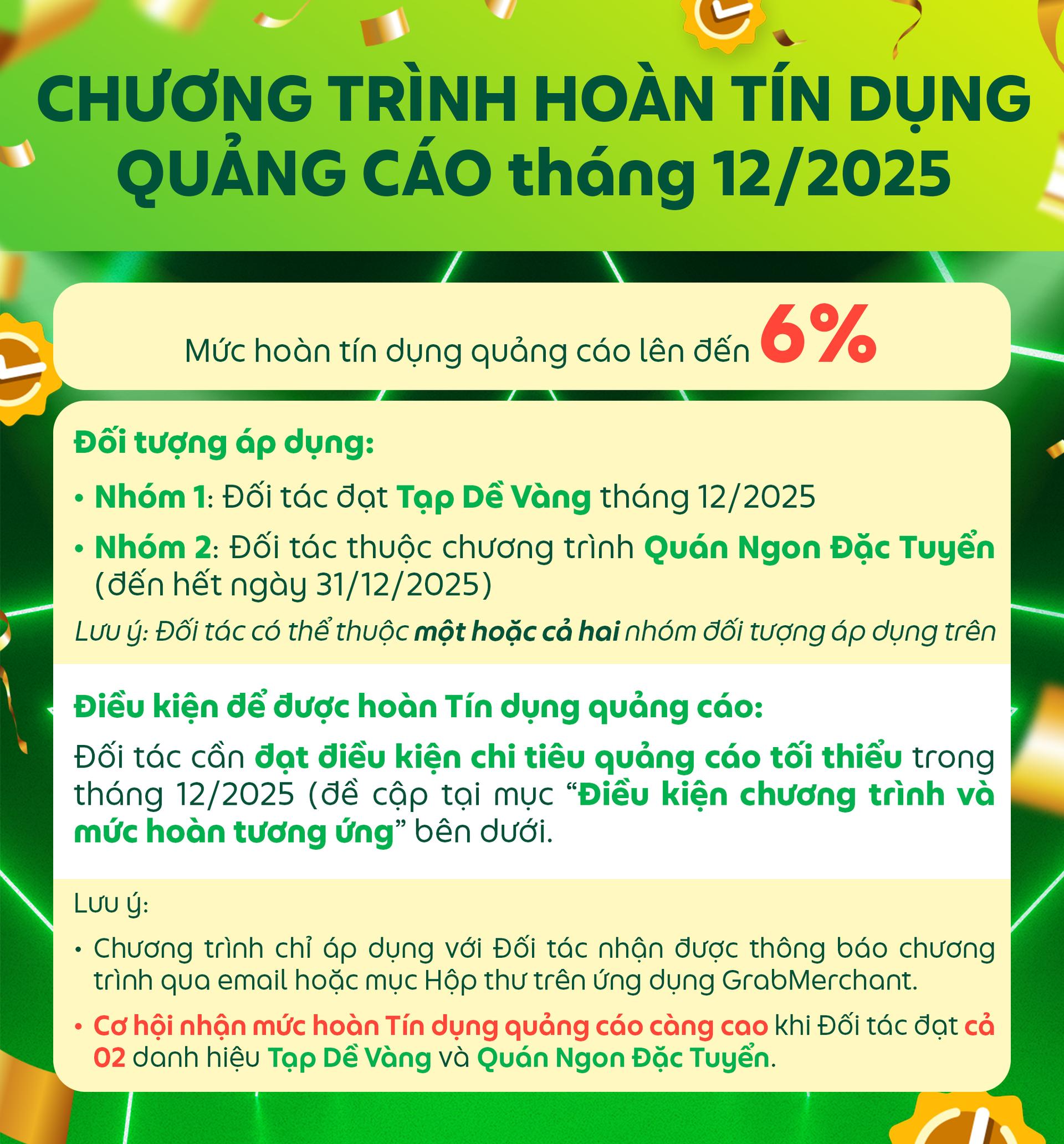 🔥 Cùng Grab khởi động tháng 12 với ưu đãi hấp dẫn từ chương trình “Hoàn Tín dụng Quảng cáo". Mức hoàn tín dụng quảng cáo lên đến 6%.