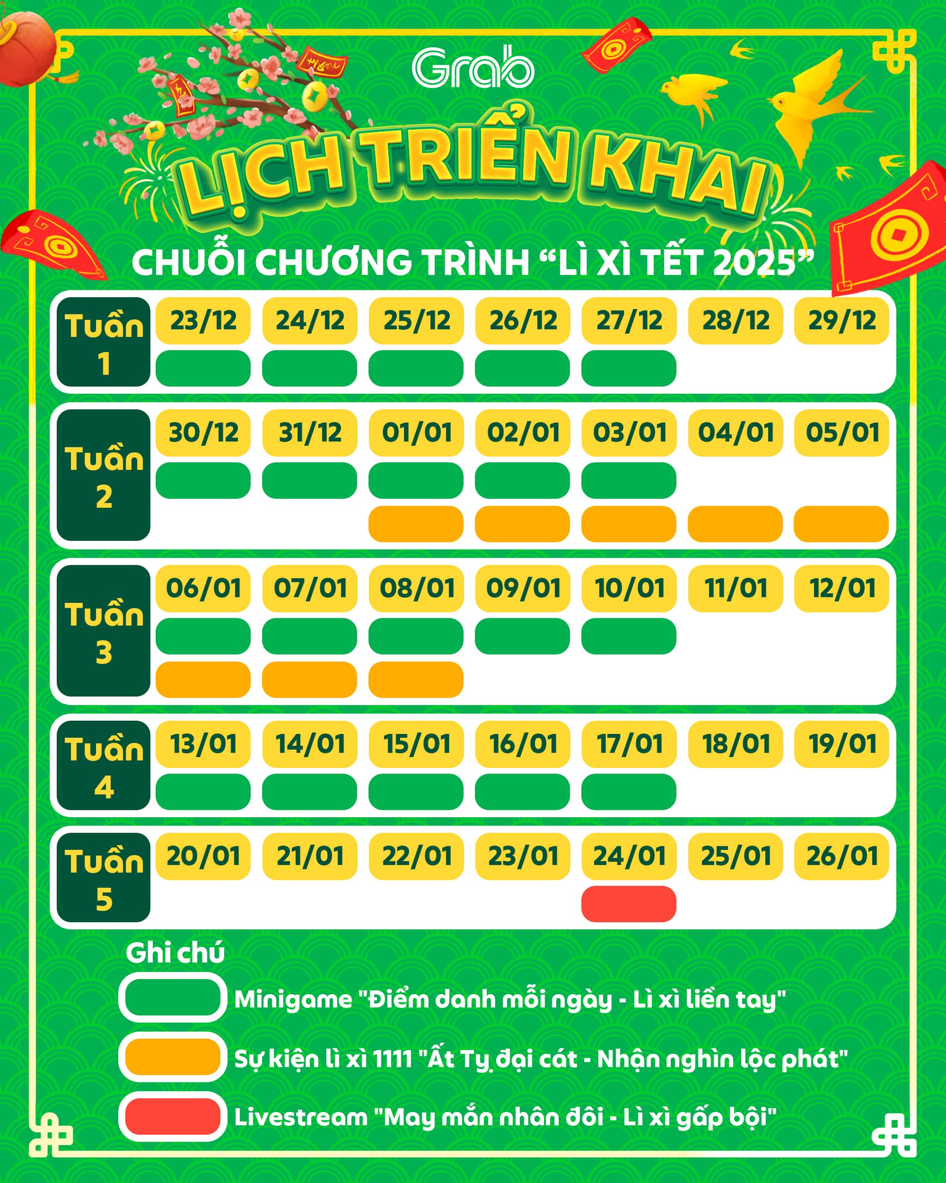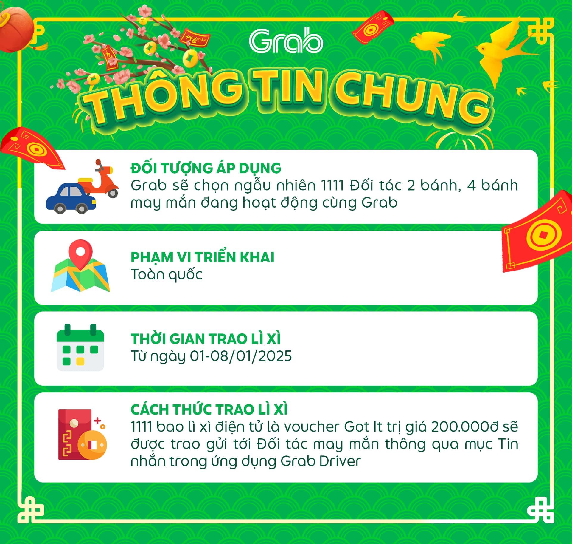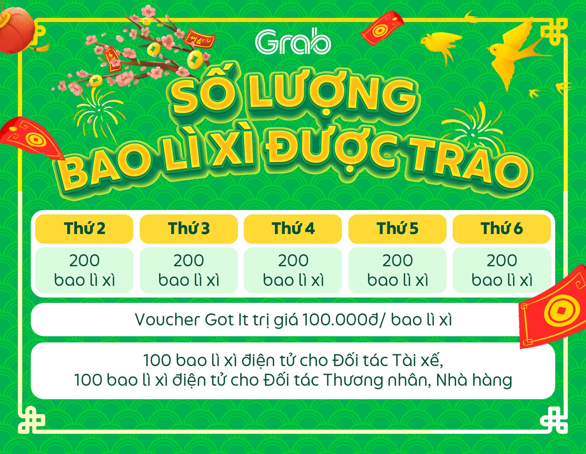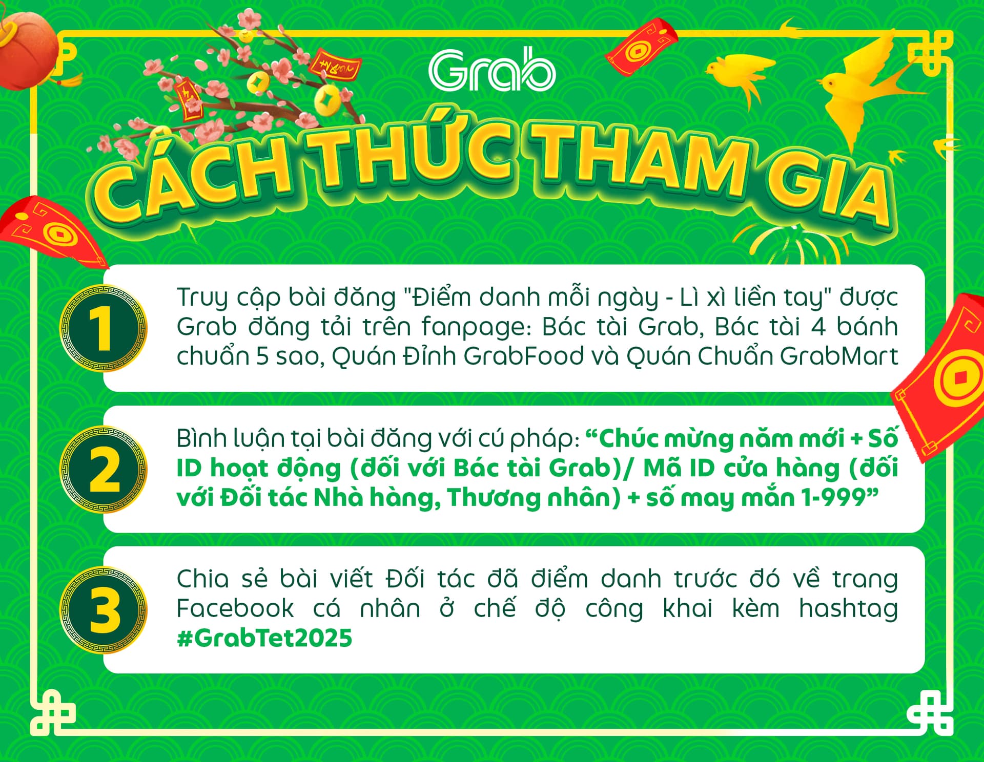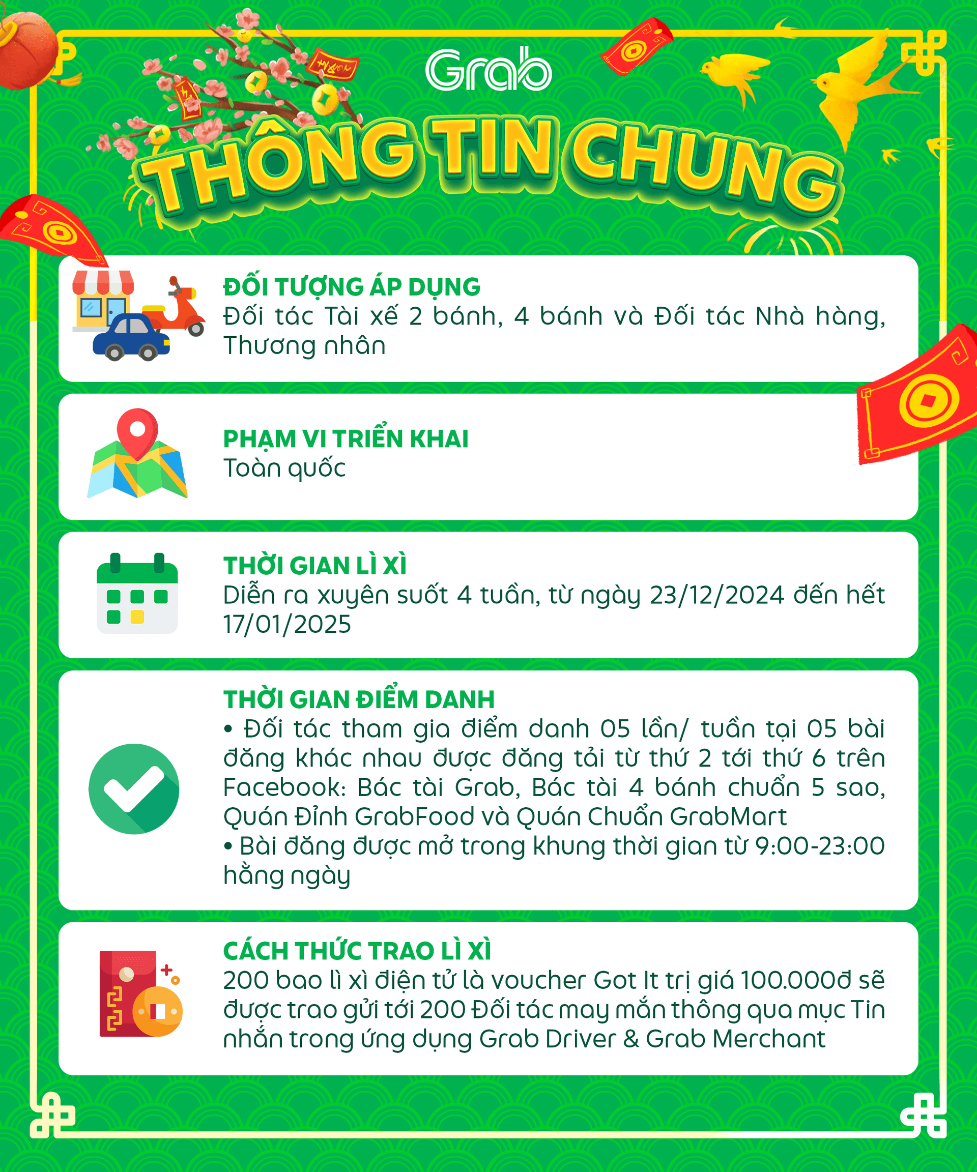 Tiếp nối sự thành công vang dội của chuỗi chương trình “Lì xì Tết Giáp Thìn 2024”, cùng với mong muốn mang lại cho các Bác tài Grab và Đối tác Nhà hàng, Thương nhân “triệu sự bất ngờ - tỷ lần hạnh phúc”, chuỗi chương trình “Lì xì Tết 2025” chính thức “chào sân” 💚🧧