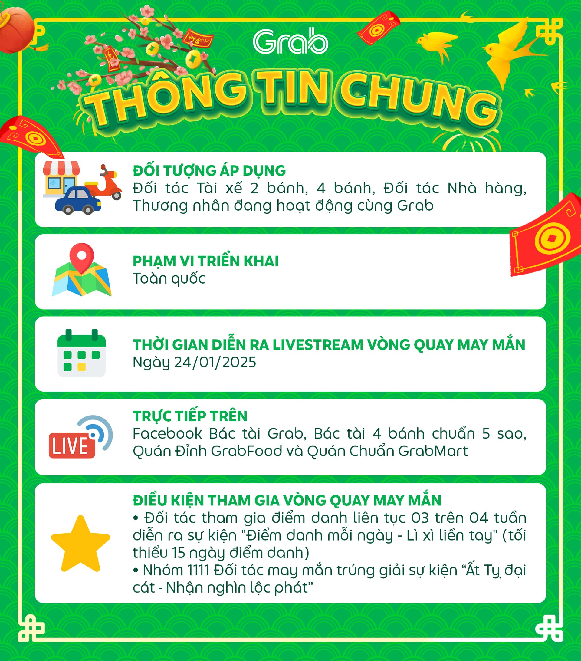 Cảm ơn tất cả Đối tác đã đồng hành cùng Grab trong năm 2024. Grab xin kính chúc tất cả Đối tác và gia đình một năm Ất Tỵ 2025 phát tài phát lộc, tiền vào ào ào, tiền ra từ từ, sức khỏe có dư, công danh tấn tới, tình duyên phơi phới, hạnh phúc thăng hoa! 💚