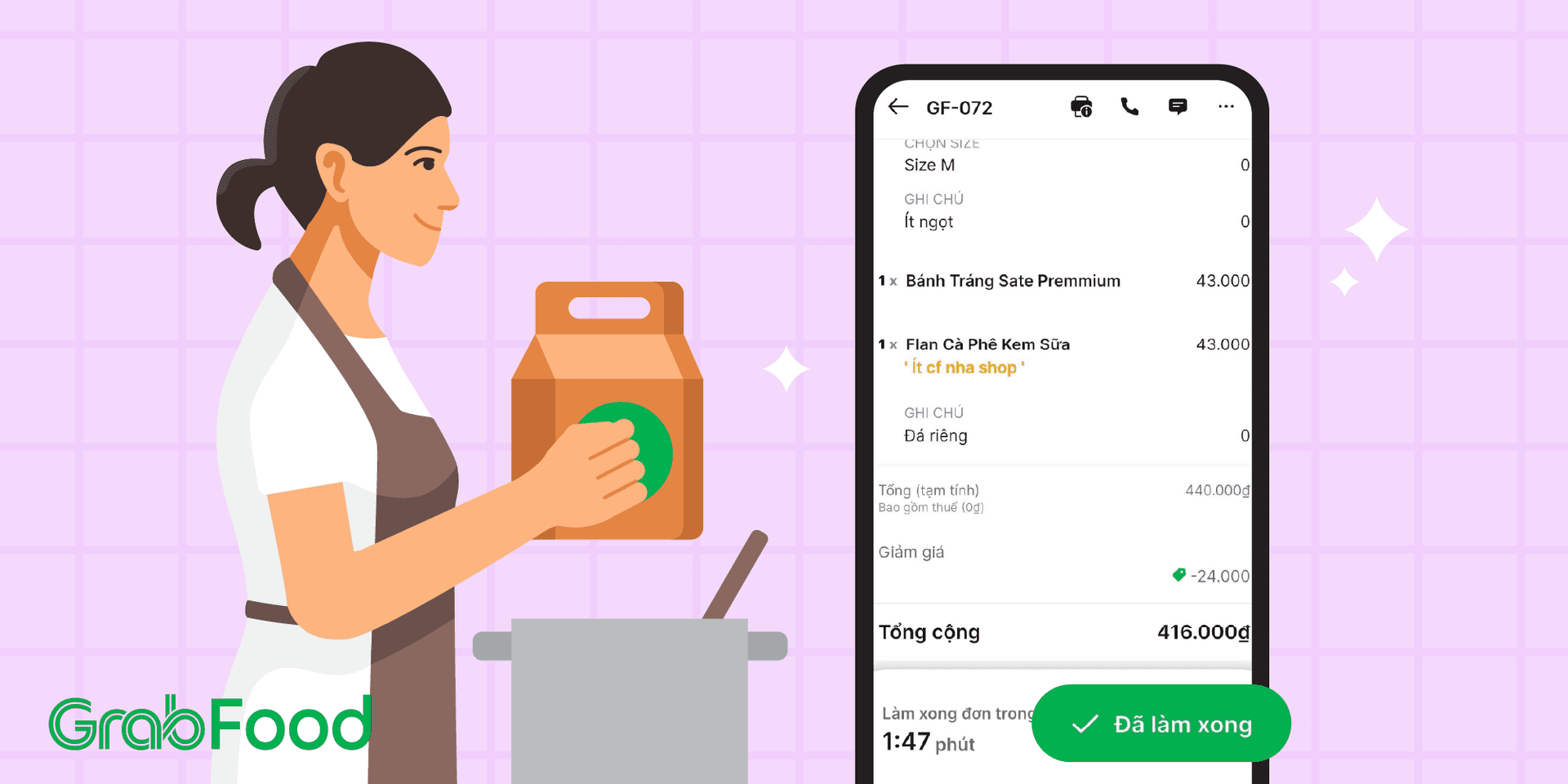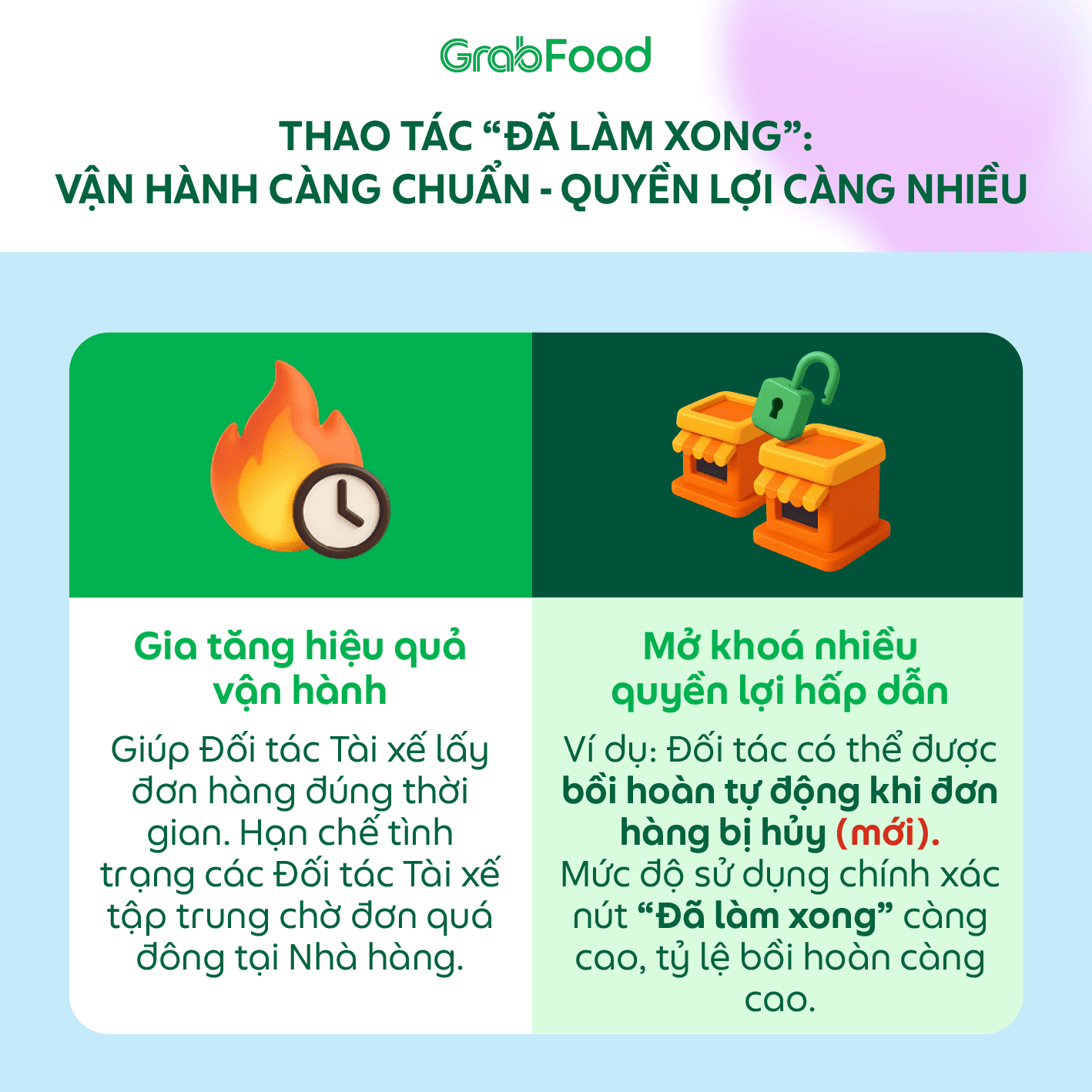 Nút “Đã làm xong” là thao tác không thể thiếu trong quy trình thực hiện đơn hàng. Khi vận hành đúng chuẩn, nút “Đã làm xong” không chỉ giúp Đối tác tối ưu hiệu quả vận hành mà còn mở khóa thêm nhiều quyền lợi hấp dẫn cho Nhà hàng.