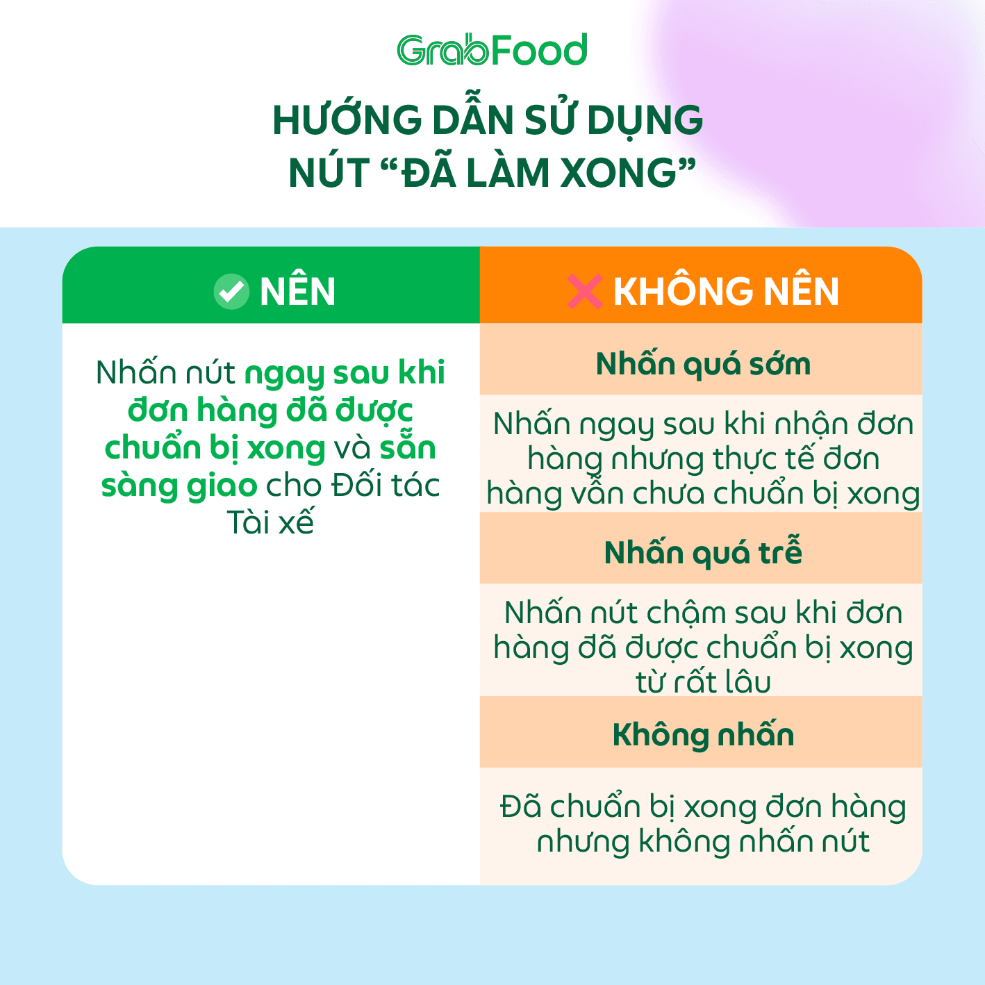✅ Mức độ thao tác chính xác càng cao, quyền lợi cho Nhà hàng càng nhiều. Vì vậy, Đối tác hãy luôn thao tác chính xác nút “Đã làm xong” cho mọi đơn hàng.