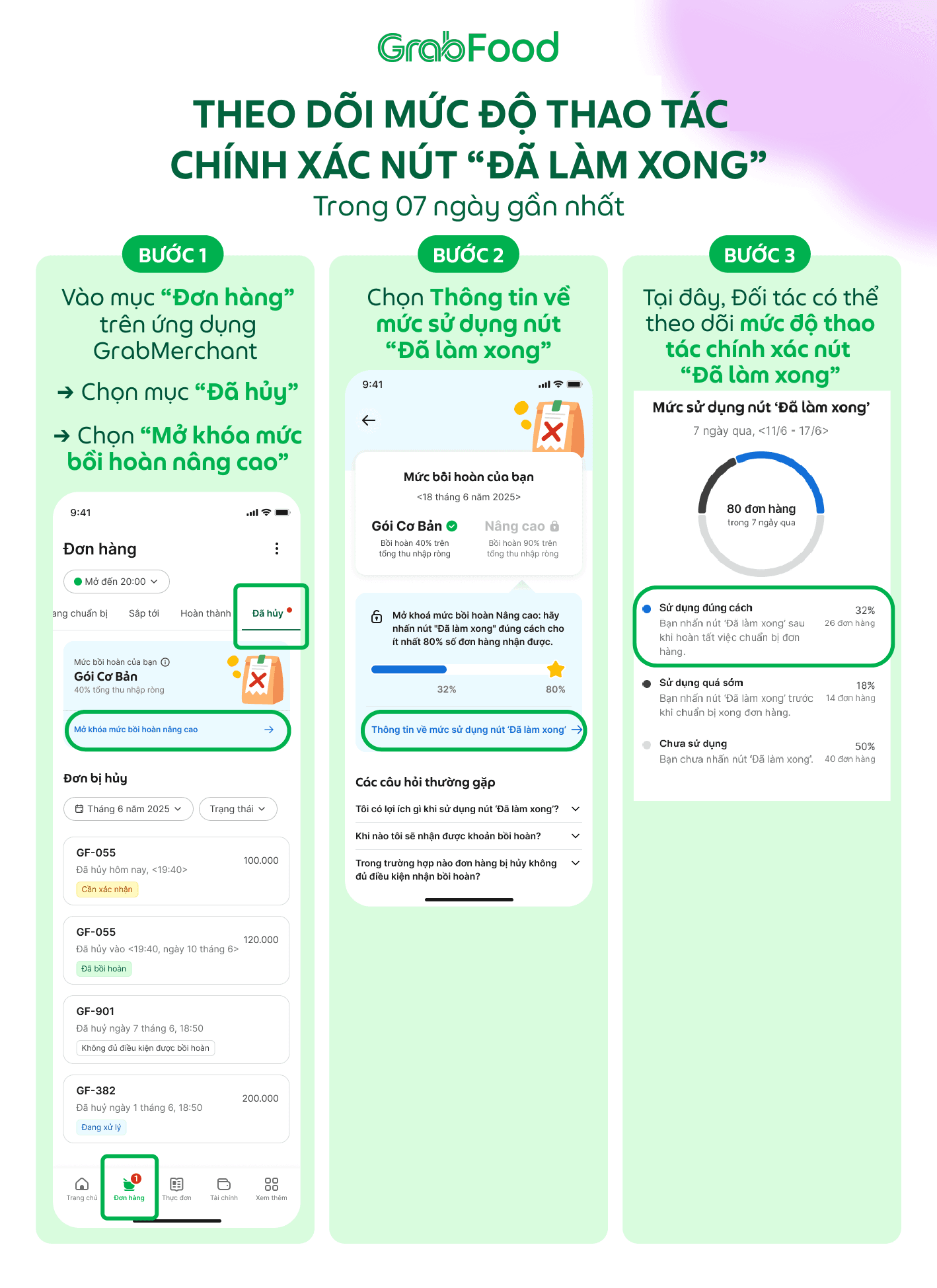 Lưu ý: Hiện tại, việc mở khóa quyền lợi để sử dụng tính năng bồi hoàn một cách tự động chỉ áp dụng thử nghiệm đối với các Đối tác Nhà hàng nhận được thông báo về cập nhật này qua email hoặc mục Hộp thư trên ứng dụng GrabMerchant.