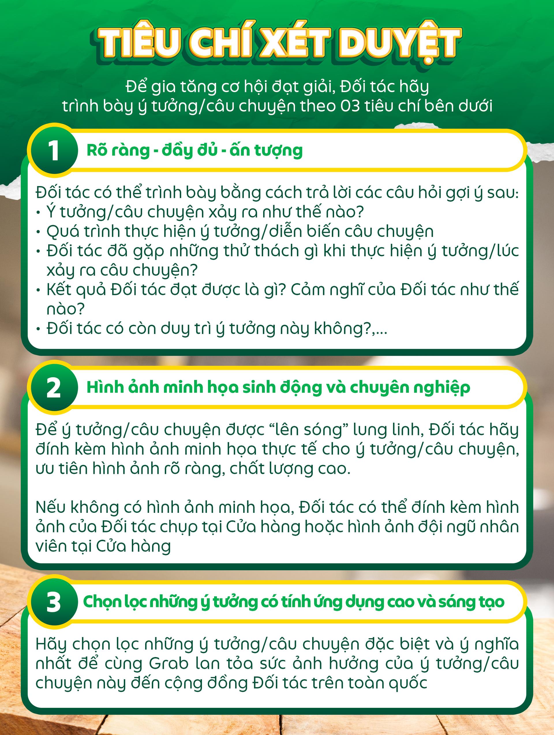 LƯU ÝA. Về giải thưởng 1. Quyết định của Grab liên quan đến giải thưởng sẽ là quyết định cuối cùng và có hiệu lực áp dụng. 2. Trong trường hợp thắng giải, giải thưởng (voucher) sẽ chỉ được gửi đến tài khoản/email của Chủ Cửa hàng. 3. Đối tác trúng giải phải nhận tất cả giải thưởng và sử dụng trong thời hạn của voucher. Nếu Đối tác không sử dụng voucher trong thời hạn, Grab sẽ không giải quyết bất kì khiếu nại hoặc yêu cầu bồi thường nào liên quan đến trường hợp này. 4. Tất cả các giải thưởng đều không có giá trị chuyển nhượng và không được quy đổi thành tiền mặt hoặc các hình thức khác. 5. Người thắng giải có nghĩa vụ đóng thuế (nếu có) theo quy định của pháp luật hiện hành. 6. Grab có quyền từ chối trao giải cho Đối tác trong các trường hợp sau: