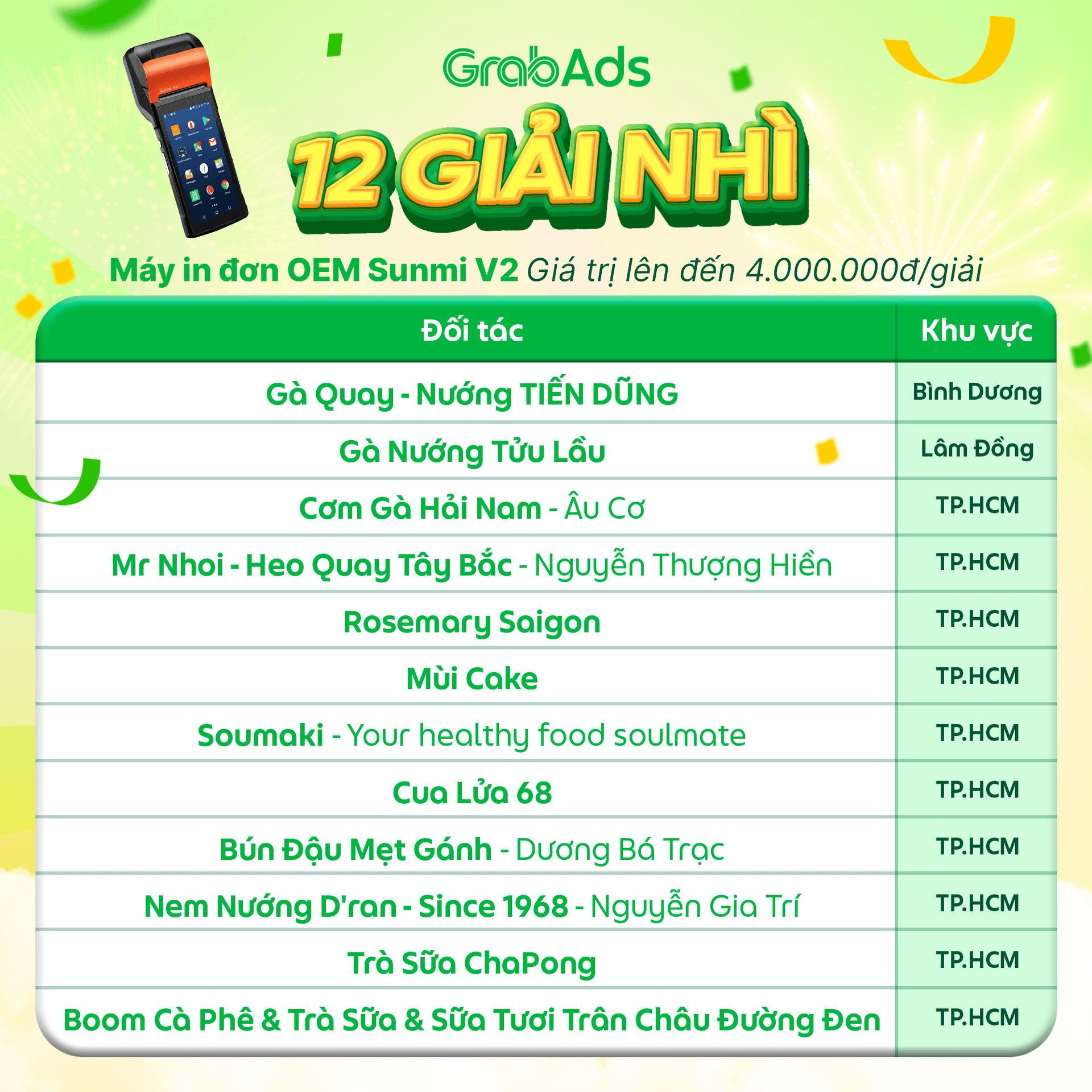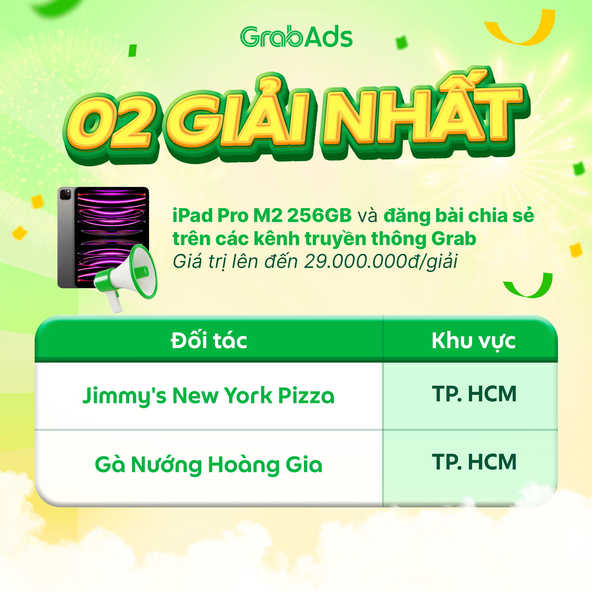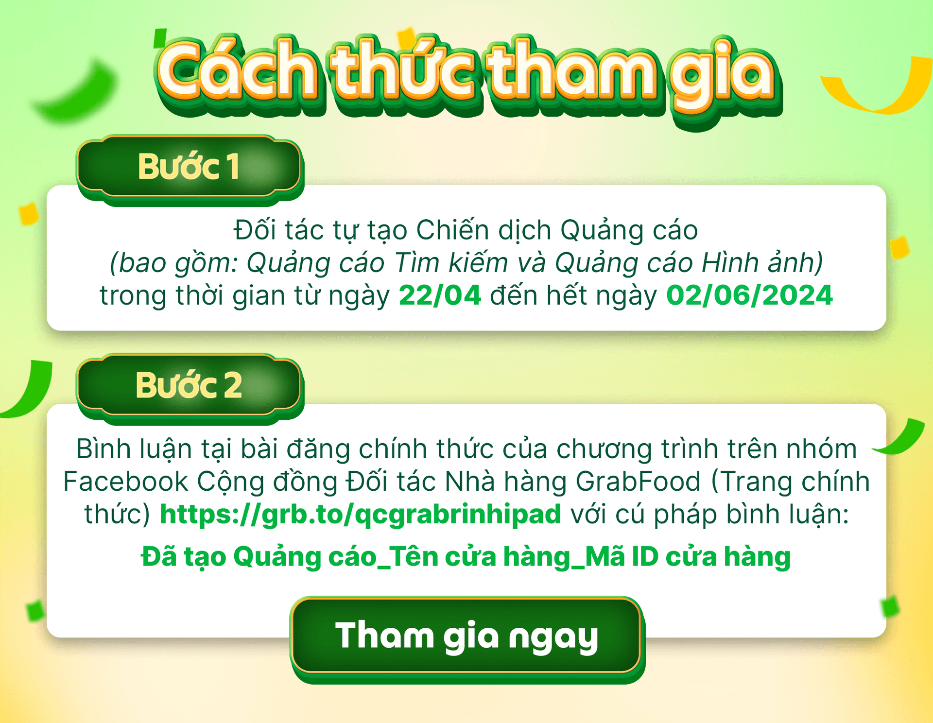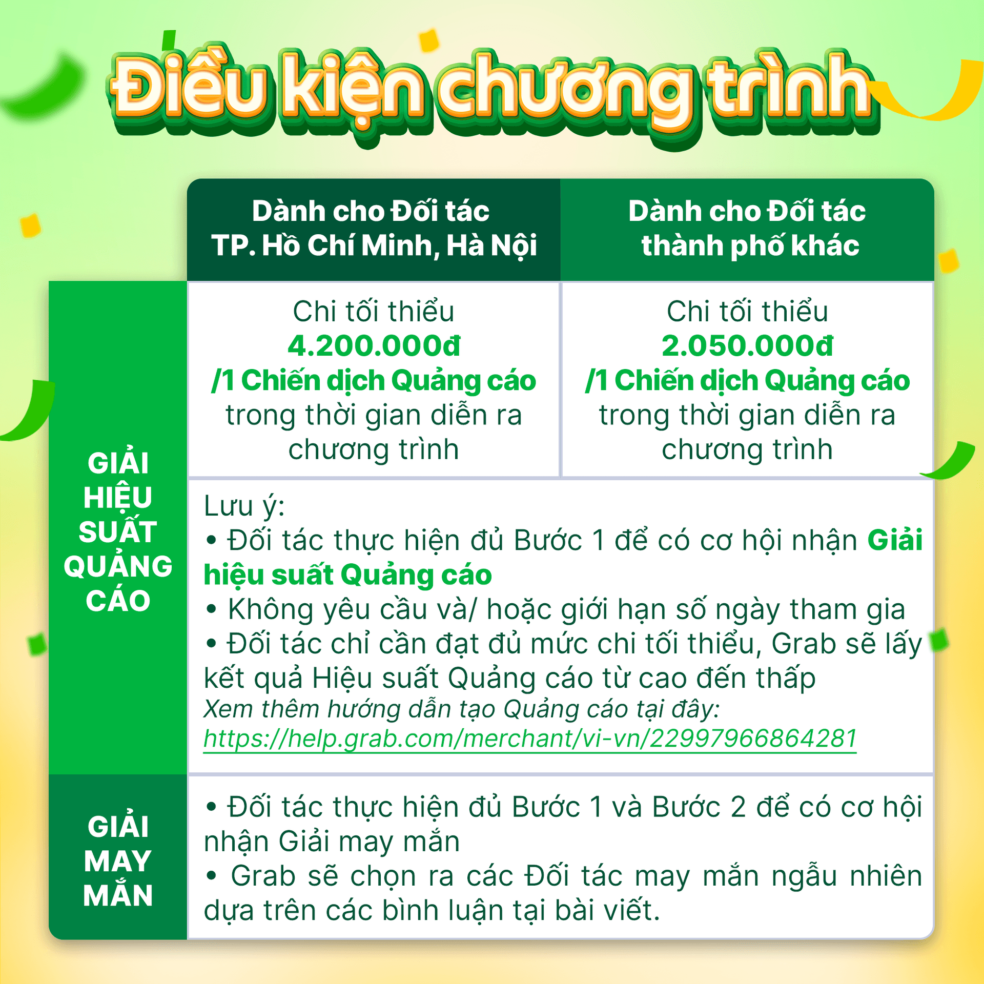 Đối tượng tham gia: Tất cả Đối tác Nhà hàng đang hoạt động cùng Grab và sử dụng tính năng Quảng Cáo trên ứng dụng GrabMerchant và Cổng thông tin GrabMerchant.