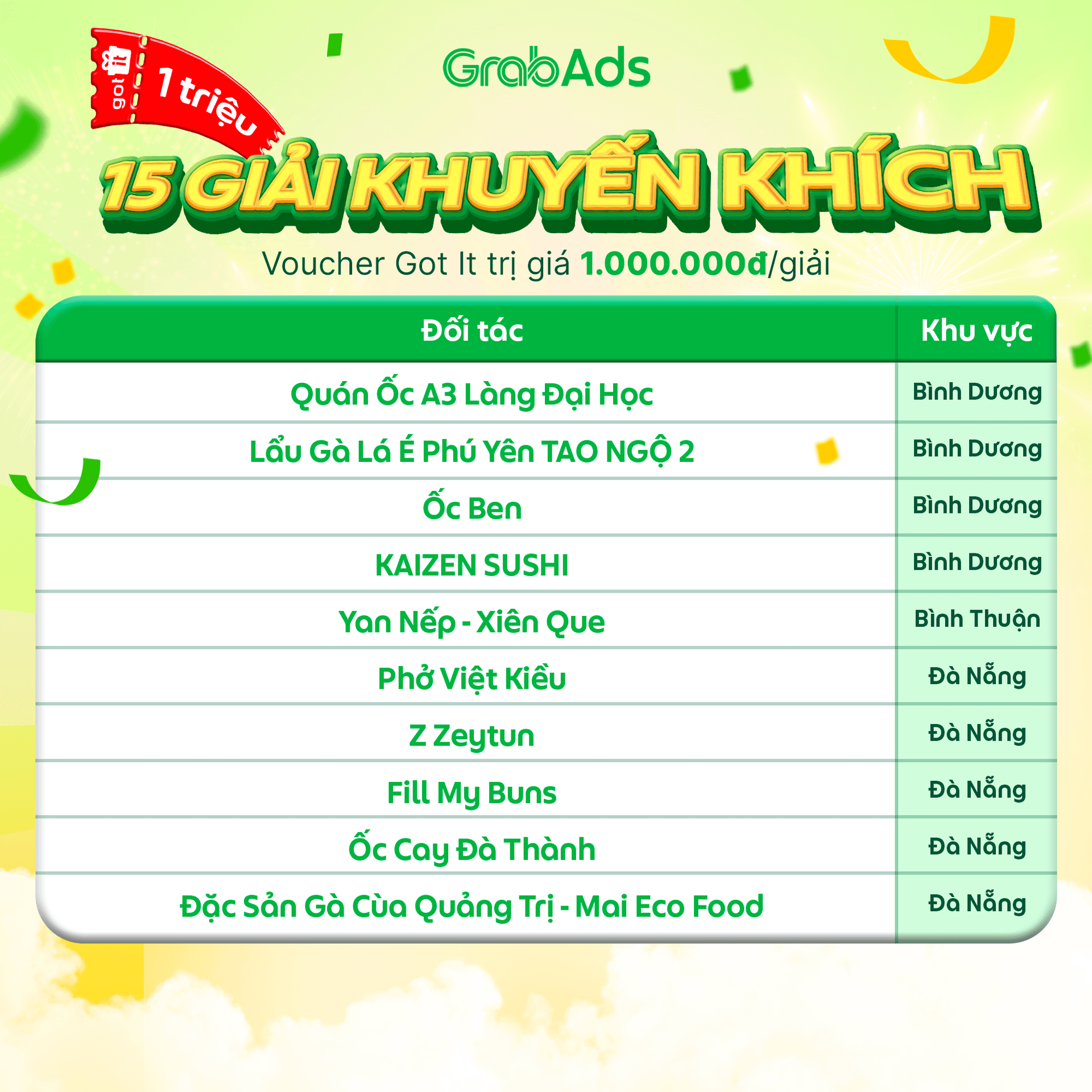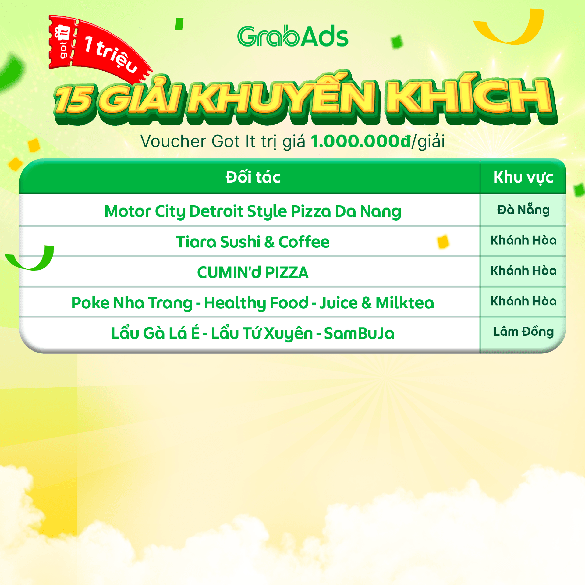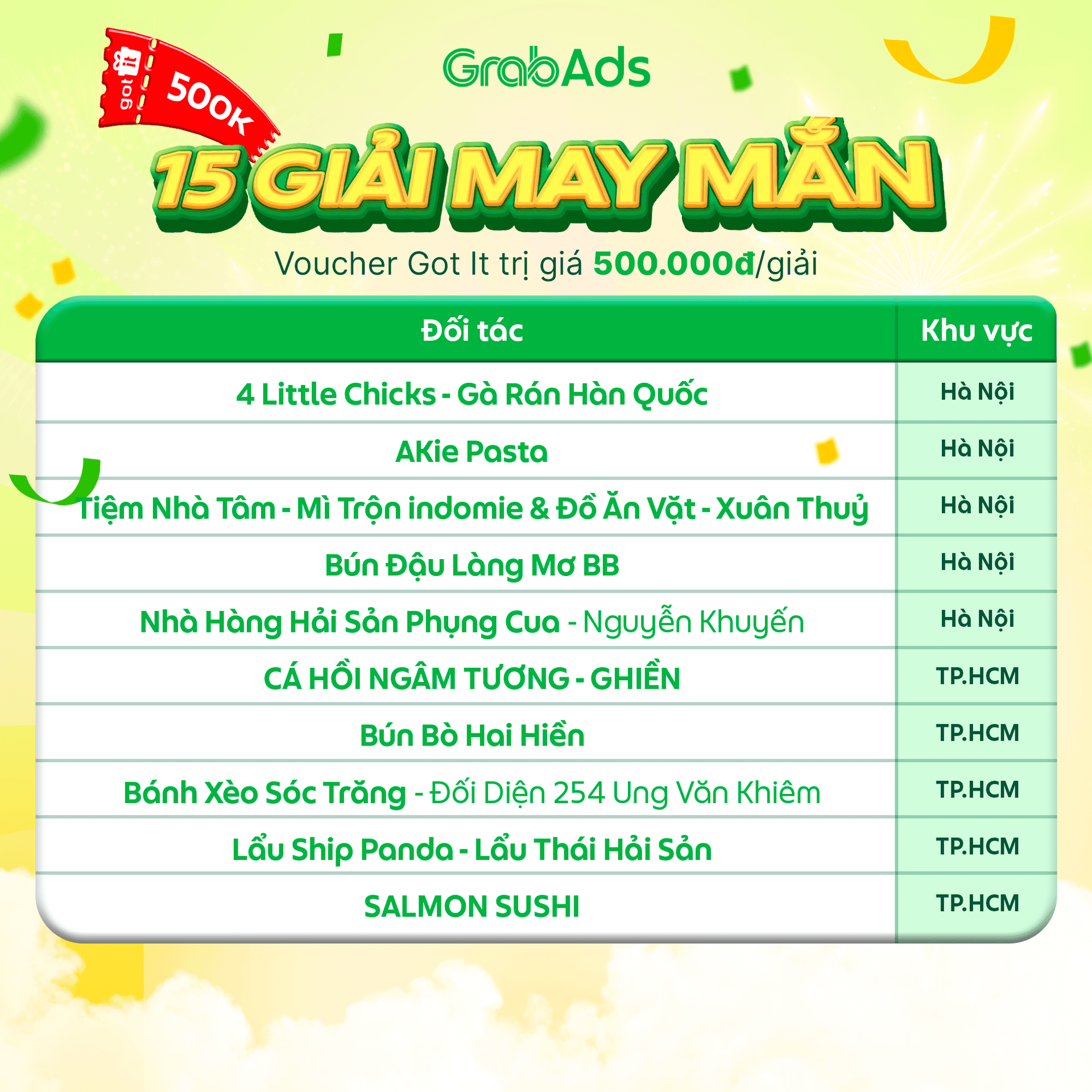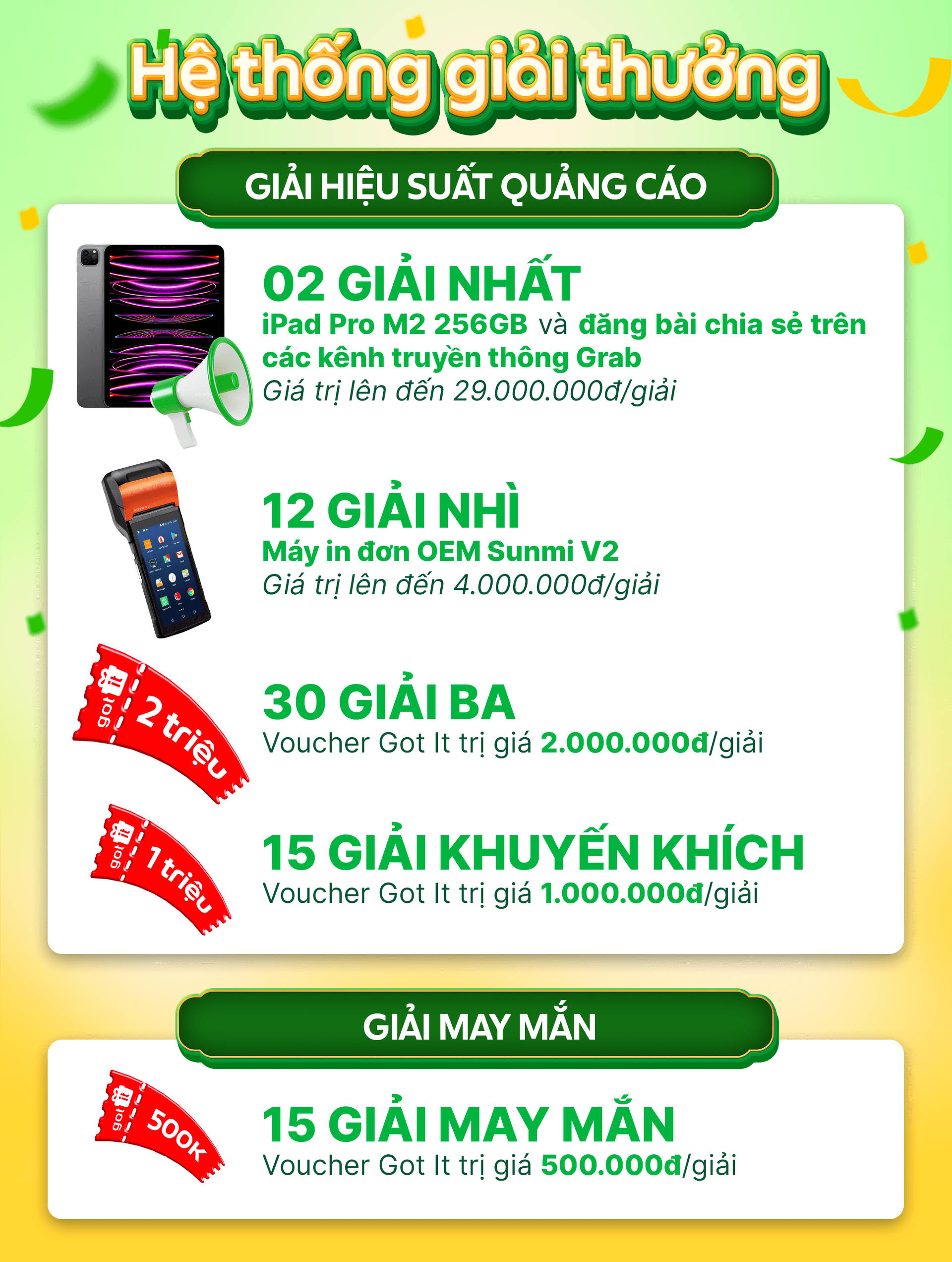 1/ Các giải thưởng là voucher Got It sẽ được Grab gửi về hộp thư tại ứng dụng GrabMerchant trong vòng 01 tháng từ ngày thông báo.