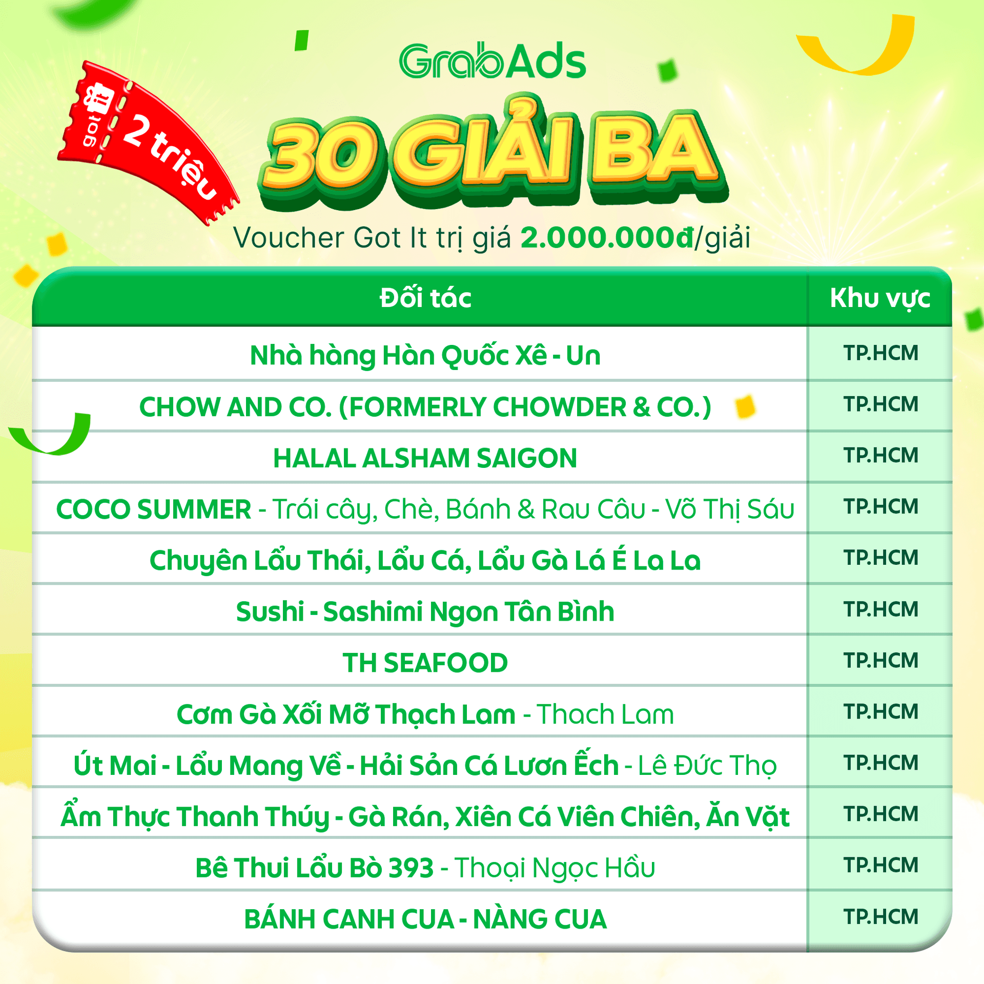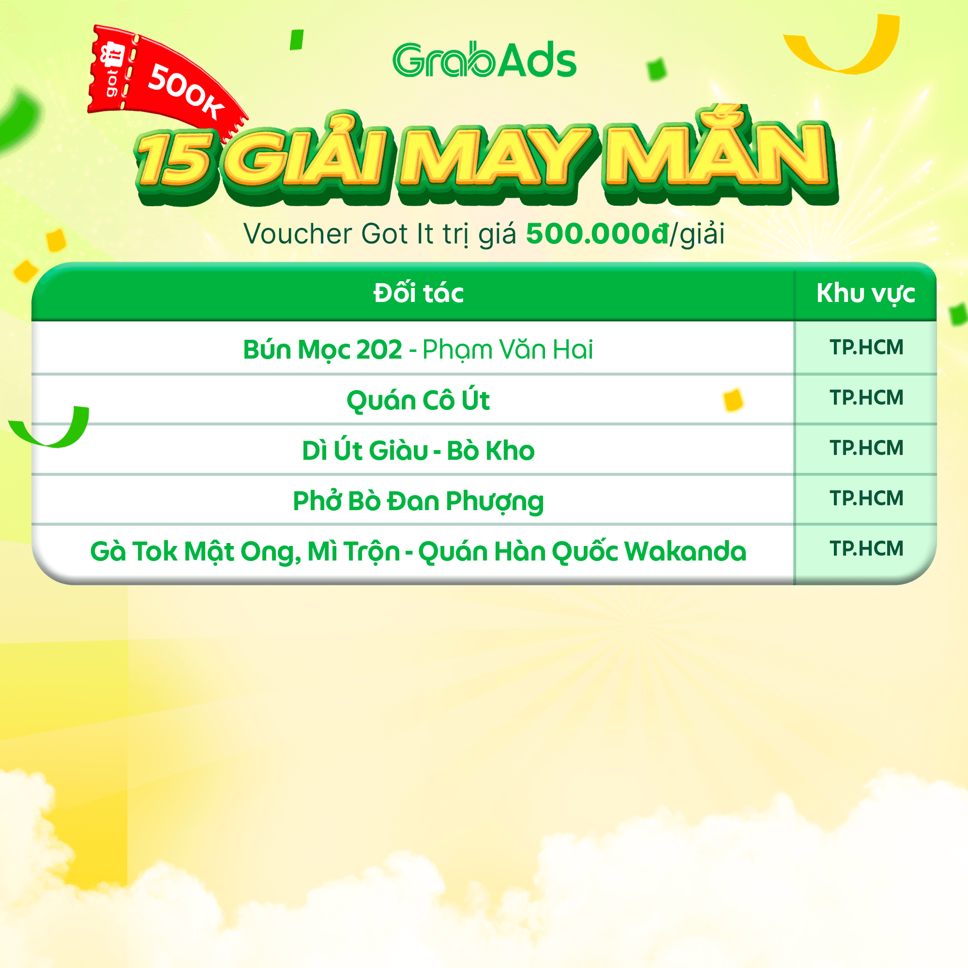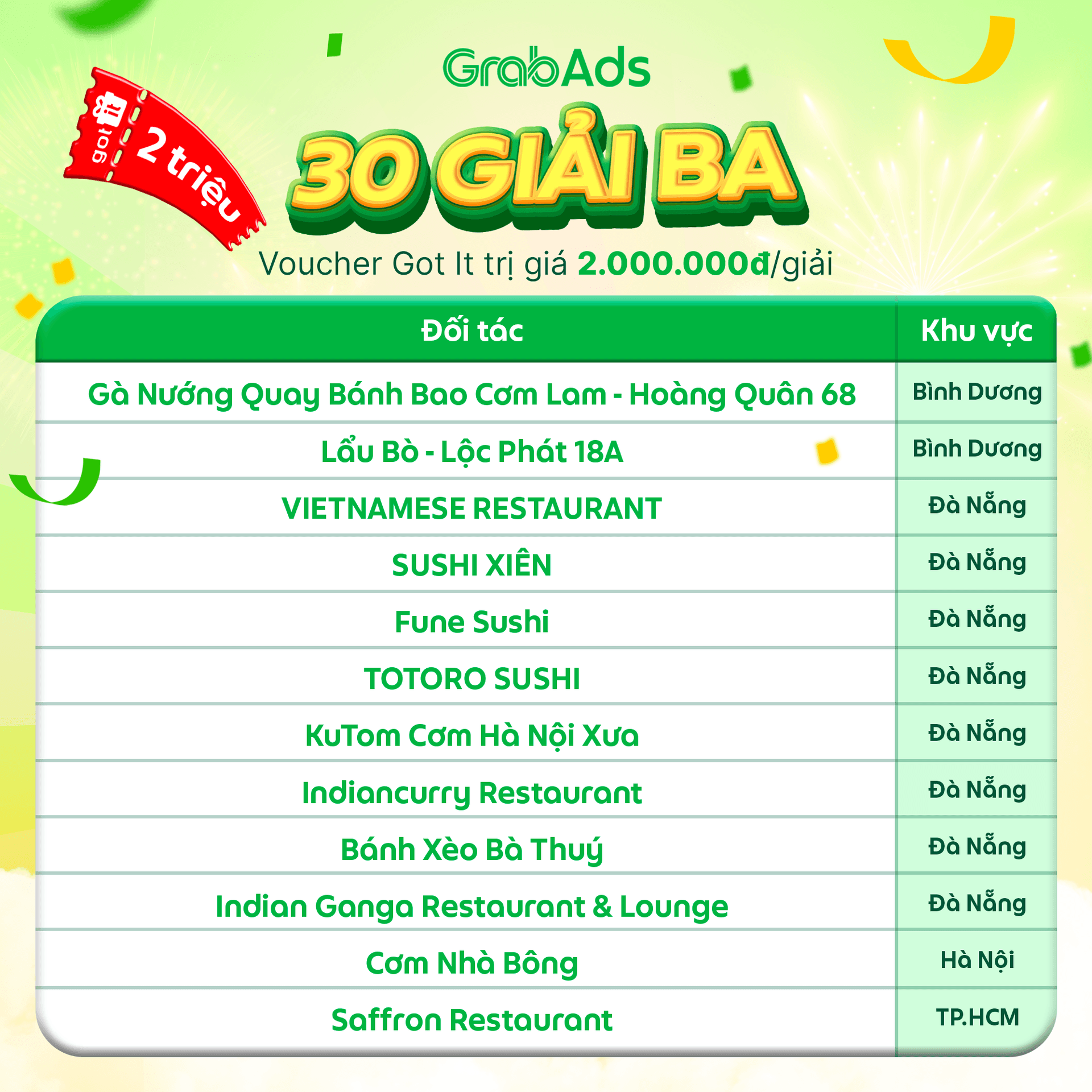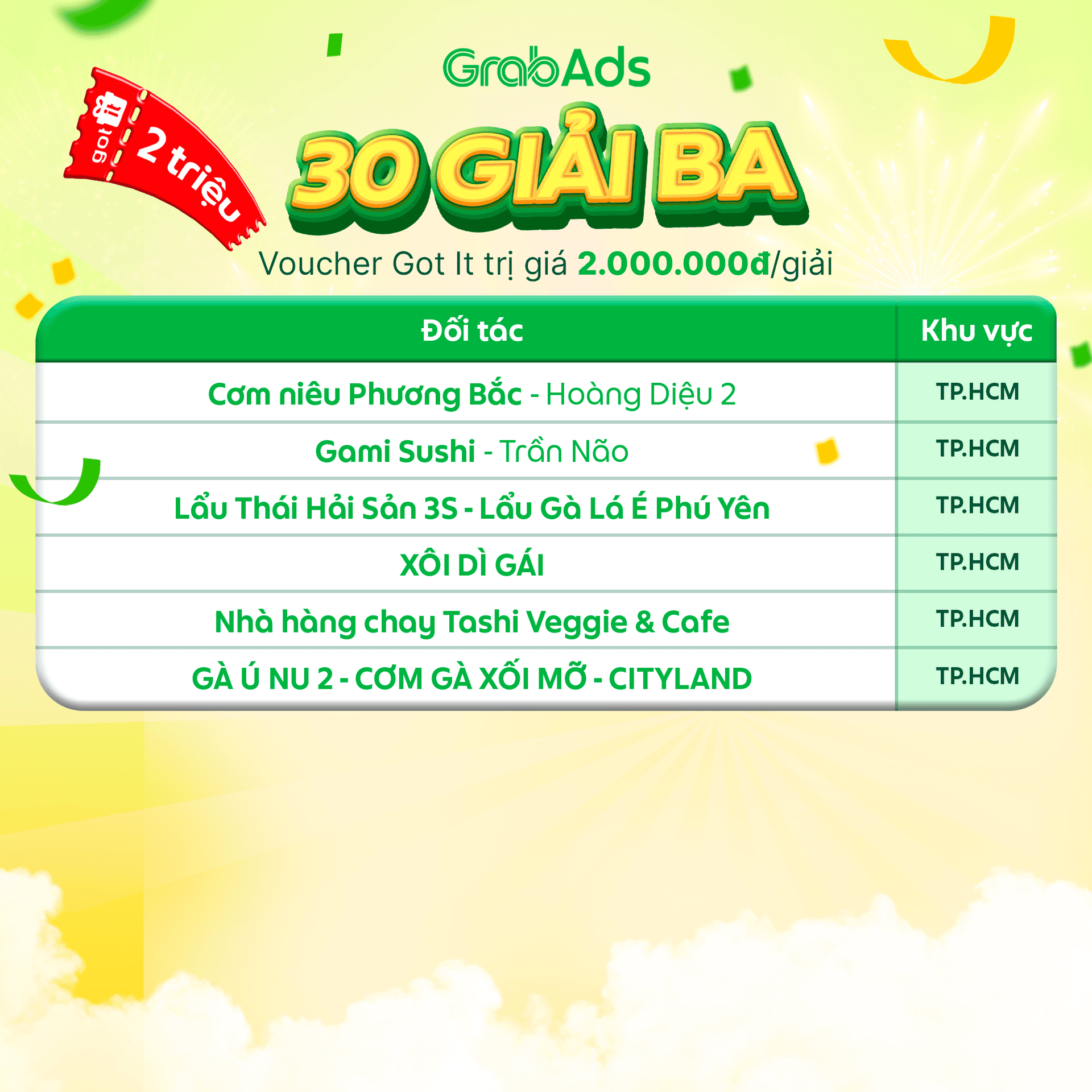 1/ Các giải thưởng là voucher Got It sẽ được Grab gửi về hộp thư tại ứng dụng GrabMerchant trong vòng 01 tháng từ ngày thông báo.