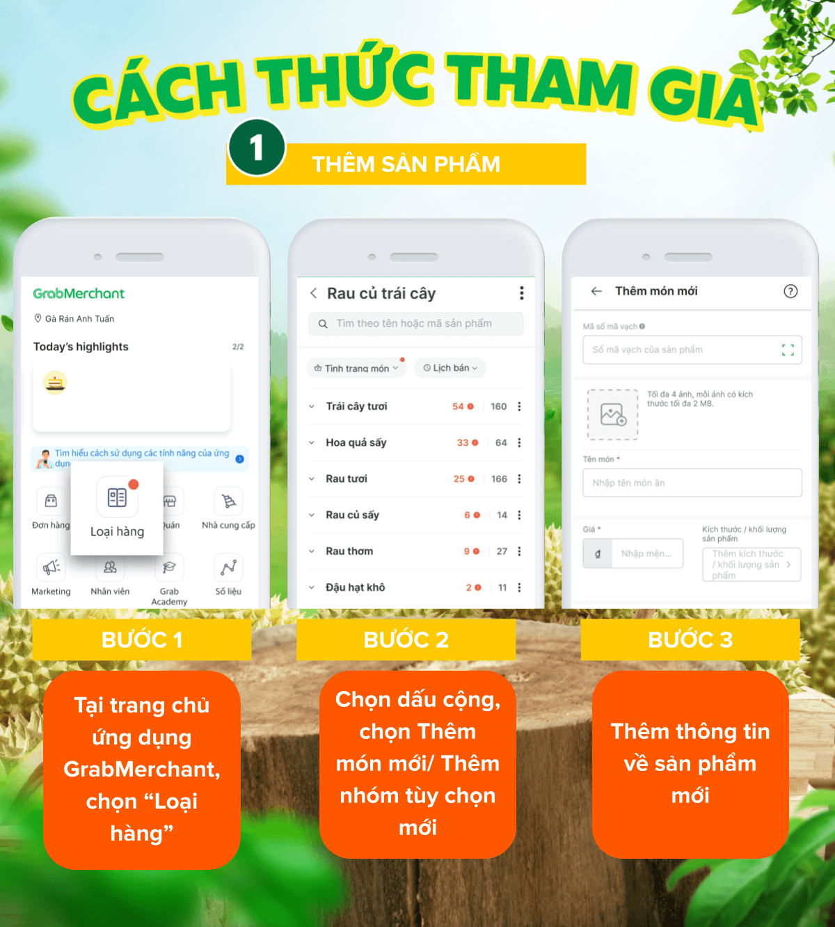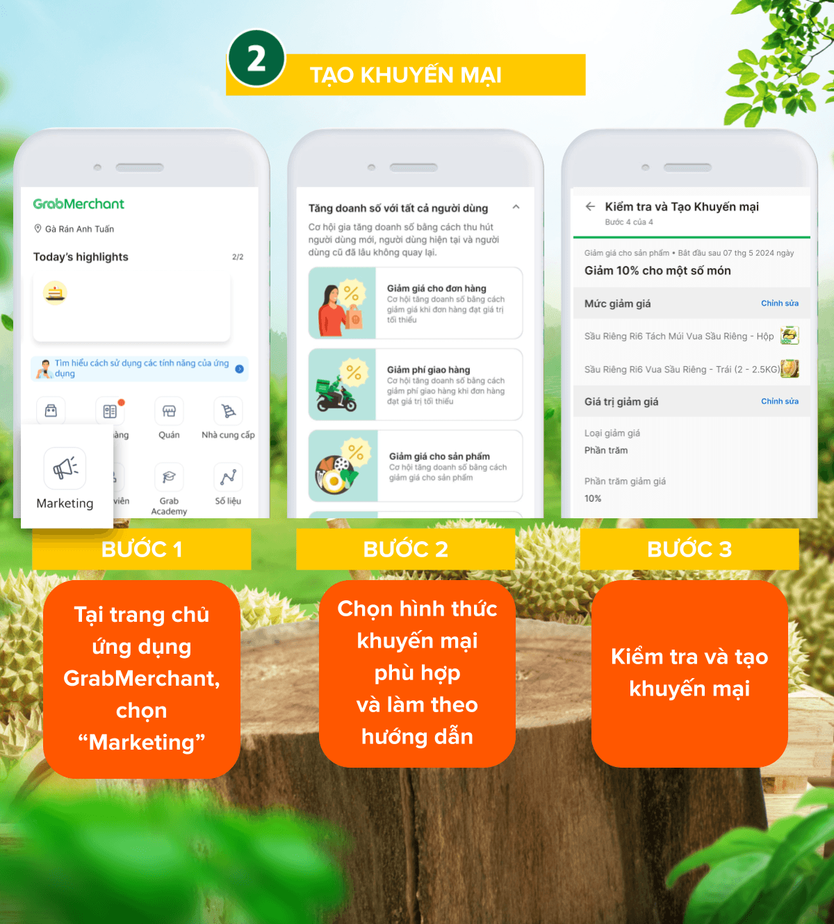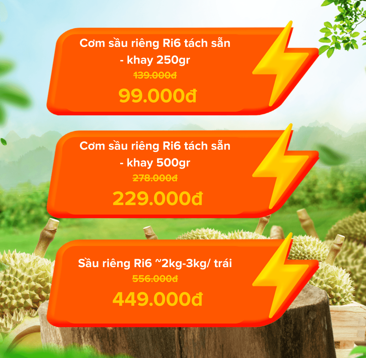 Ngoài việc đăng tải sản phẩm như thông thường, Grab gợi ý một số mẹo nhỏ để sản phẩm có thể thu hút nhiều người dùng tìm kiếm nhất: 🛒 Tên sản phẩm: Điền đầy đủ thông tin sản phẩm theo Tiếng Việt có dấu, không viết tắt, không dùng từ ngữ địa phương, bao gồm trọng lượng sản phẩm là điểm cộng Ví dụ: Sầu riêng Ri6 ~ 2kg- 3kg/ trái hoặc Cơm sầu riêng Ri6 tách sẵn - khay 250gr 🛒 Hình ảnh sản phẩm: Rõ nét, ưu tiên ảnh chụp toàn cảnh, không nên để số điện thoại, bộ phận cơ thể người vào hình ảnh 🛒 Chất lượng sản phẩm: Đảm bảo an toàn vệ sinh thực phẩm 🛒 Giá niêm yết sản phẩm: Mang tính cạnh tranh, phù hợp nhu cầu của người dùng Grab đề xuất giá khuyến mại: |