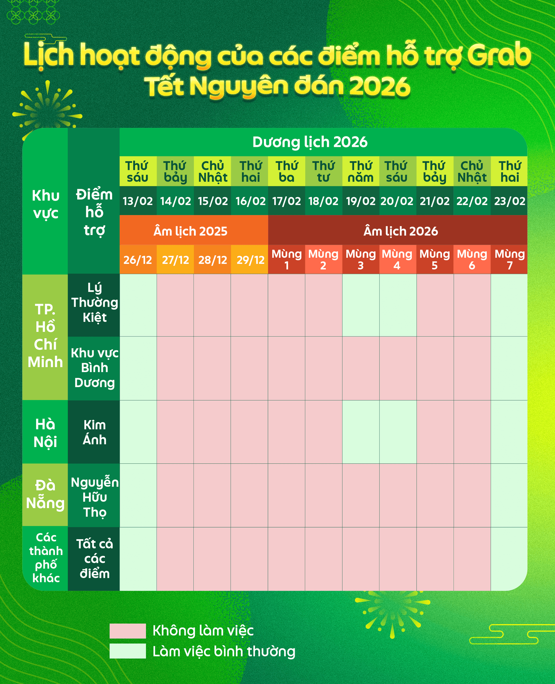 🌸 Lịch hoạt động của các điểm hỗ trợ Grab