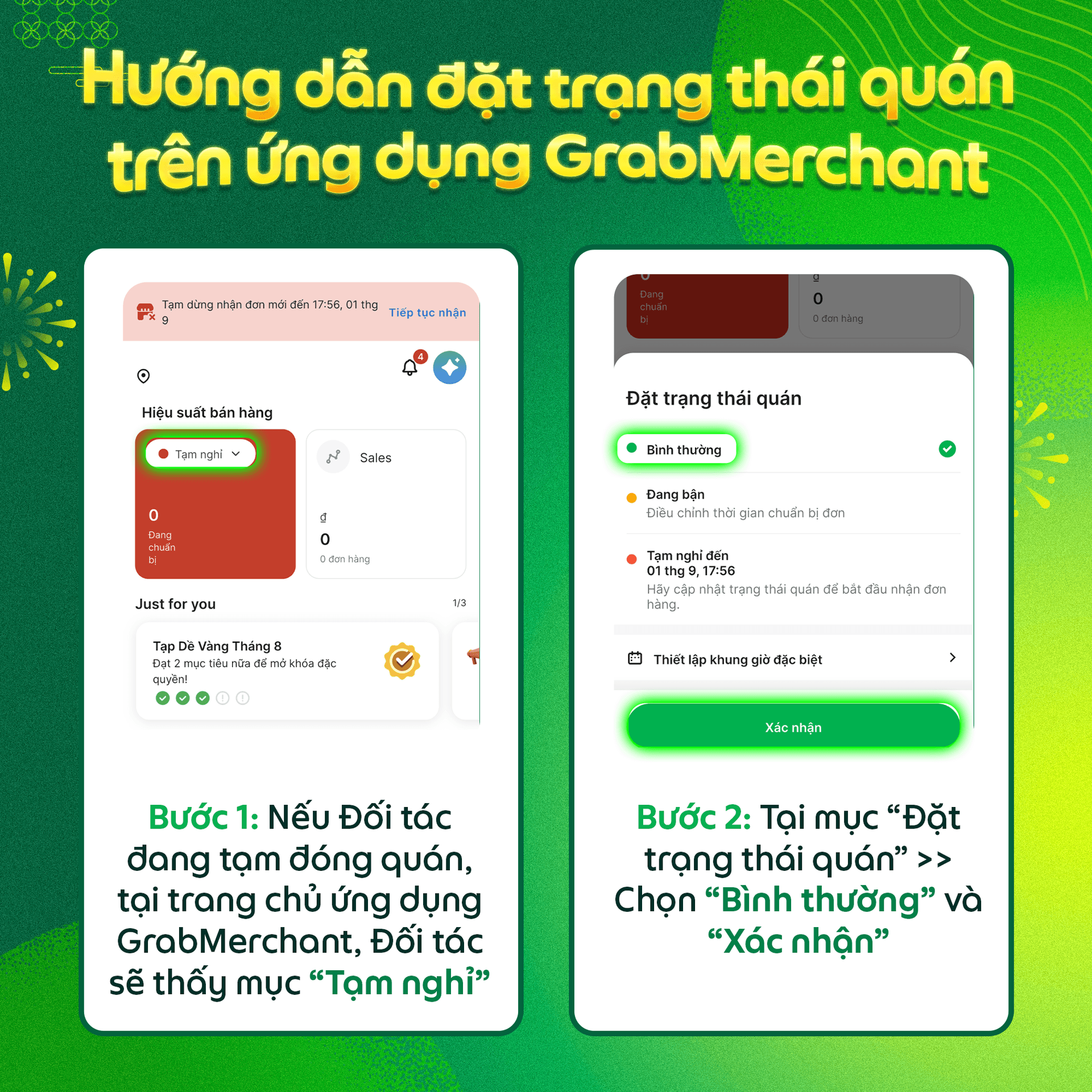 Đối tác hãy chủ động thay đổi trạng thái Nhà hàng/Cửa hàng trên ứng dụng GrabMerchant theo hướng dẫn dưới đây để hiển thị với Người dùng ngay sau Tết, Đối tác nhé.