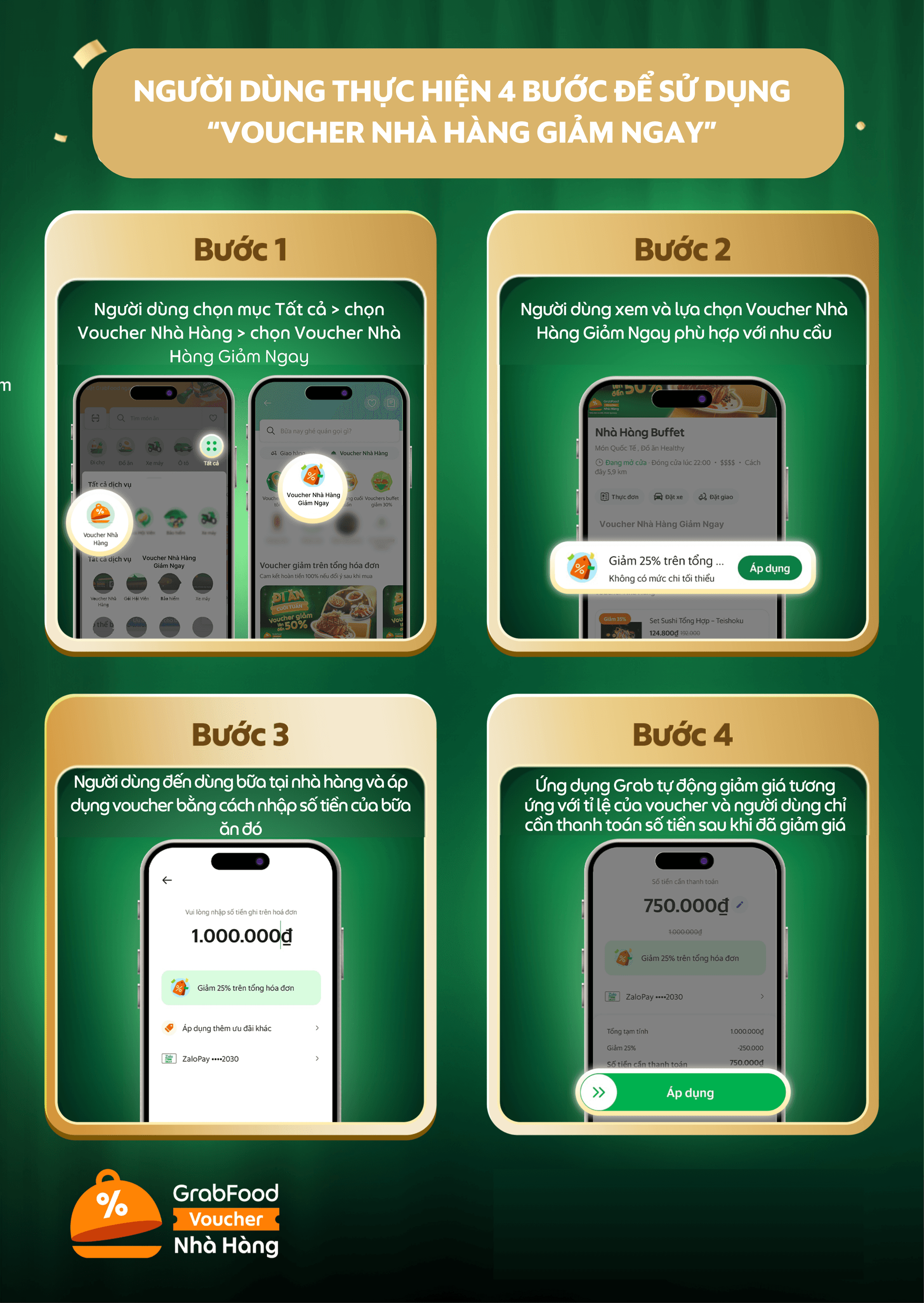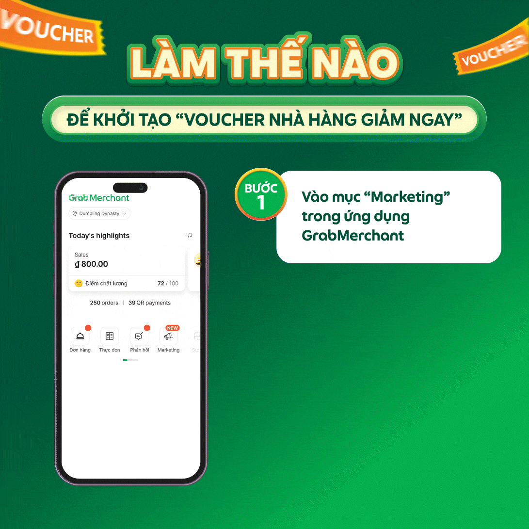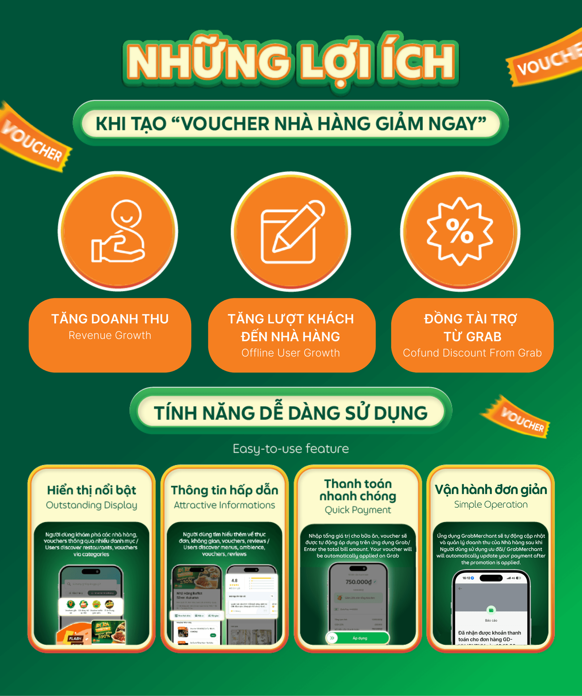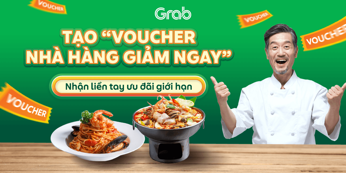 “Voucher Nhà Hàng Giảm Ngay” là công cụ cho phép Nhà hàng thực hiện chiến dịch giảm giá hấp dẫn cho người dùng trên ứng dụng GrabMerchant. Người dùng có thể khám phá các ưu đãi của Nhà hàng trên ứng dụng Grab và nhận được giảm giá trực tiếp trên hóa đơn ngay tại Nhà hàng mà không cần phải mua trước. Đây là một công cụ giúp nhà hàng tối ưu hiển thị và tăng lượt khách đến Nhà hàng. |