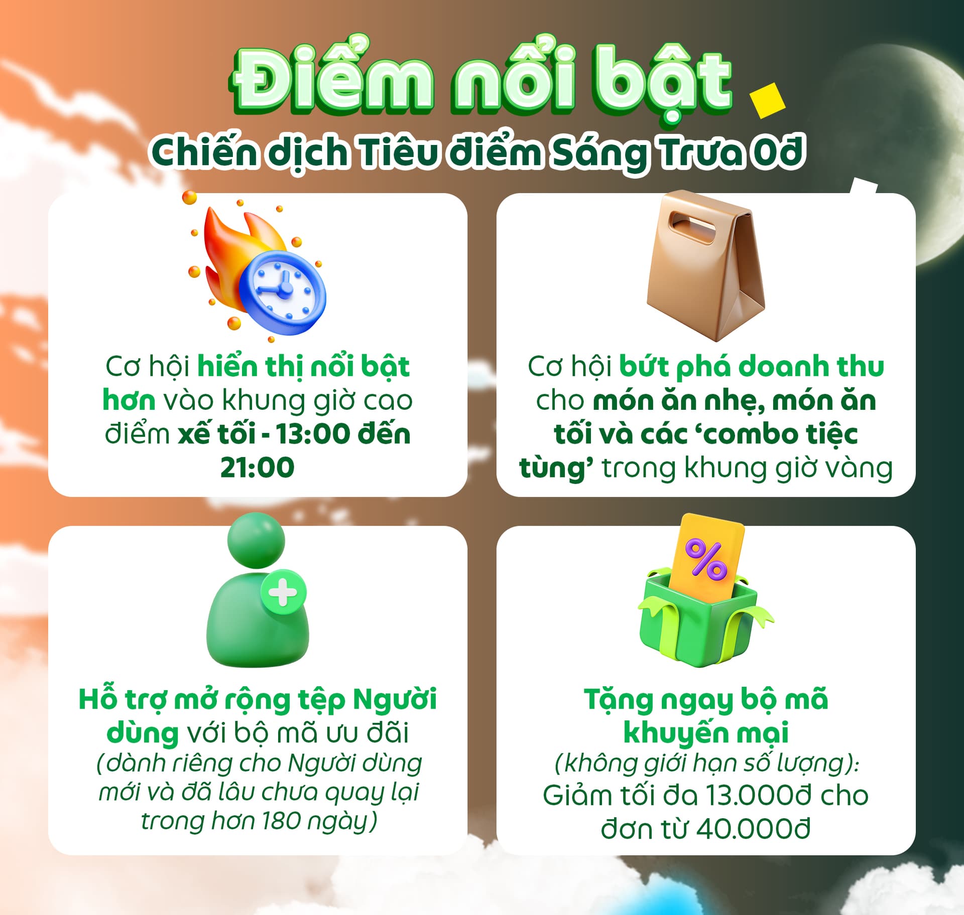 🌞 Phiên bản nâng cấp với mục tiêu tối ưu và trải nghiệm tham gia dễ dàng, giúp Quý Đối tác kinh doanh điểm tâm sáng và món chính đẩy đơn vào khung giờ cao điểm cuối ngày.
