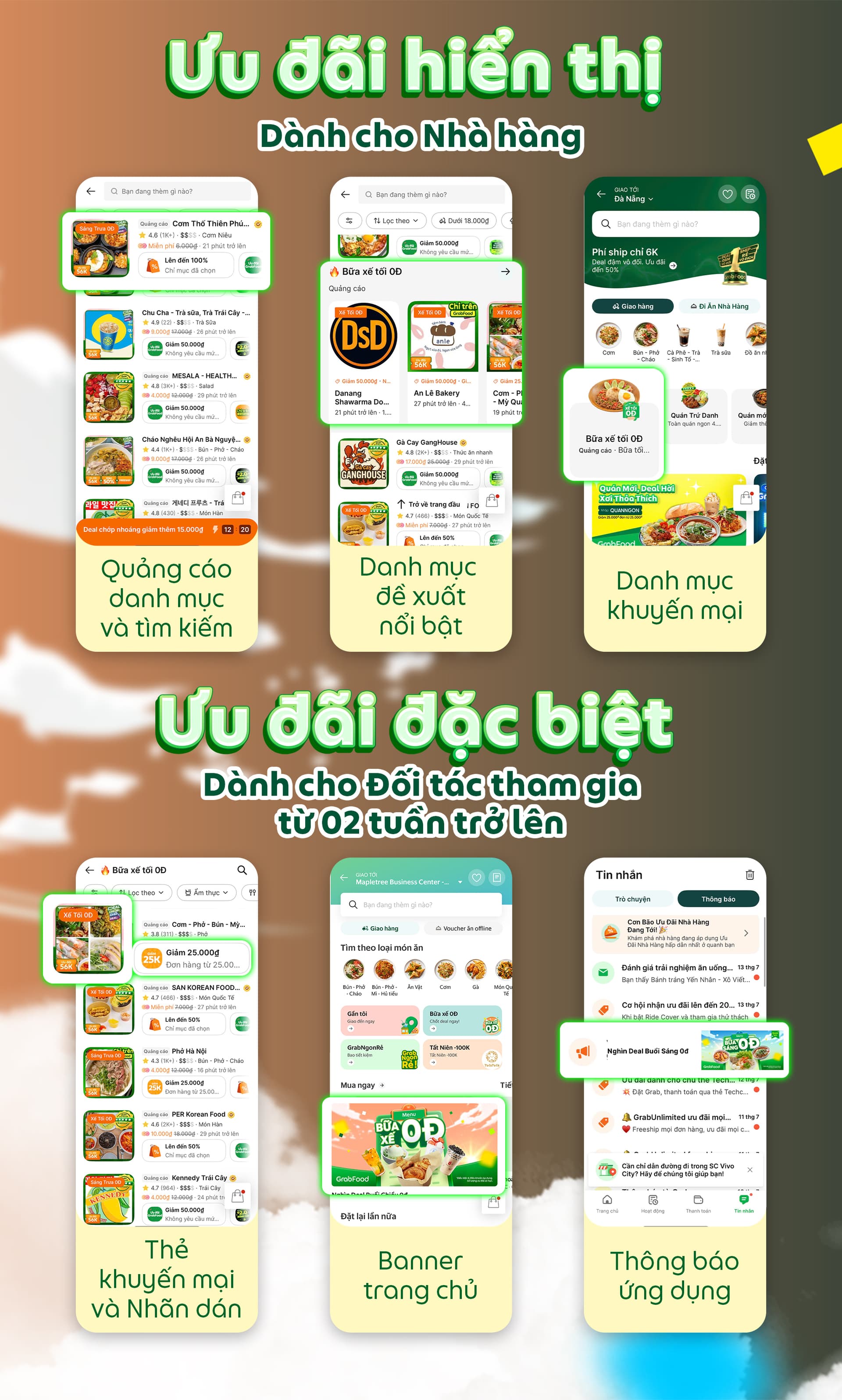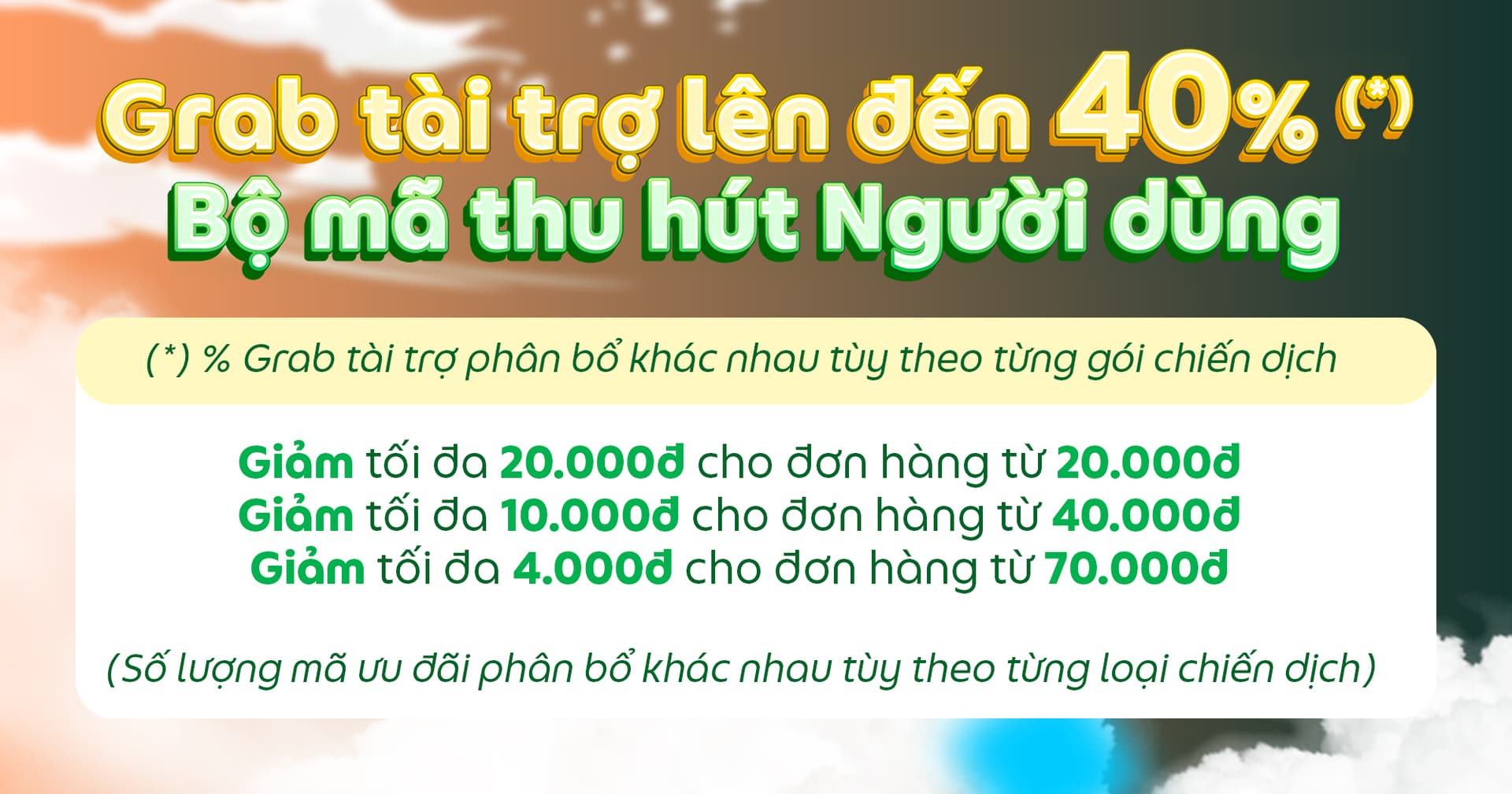 Chiến dịch Tiêu điểm có sự đồng tài trợ từ Grab chỉ áp dụng cho nhóm Đối tác đạt tiêu chuẩn hiệu suất của chương trình Tạp Dề Vàng (bao gồm hạng Cơ Bản, Tạp Dề Bạc & Tạp Dề Vàng). Xem thêm về tiêu chuẩn Tạp Dề Vàng tại ĐÂY.